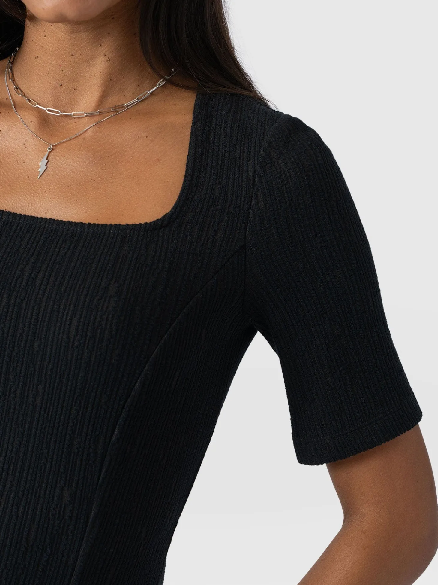 Handmade using stretch-infused organic cotton, the Akia Short Sleeve Tee in black is the perfect elevated basic to add to your wardrobe. It’s stitched to a slim-fitting silhouette with a square neckline and short sleeves. But for added interest, the entire bodice is lightly textured with subtle details. Wear yours with skirts, pants, or your favourite jeans and dress up with heels when you’re heading out under the moonlight.
