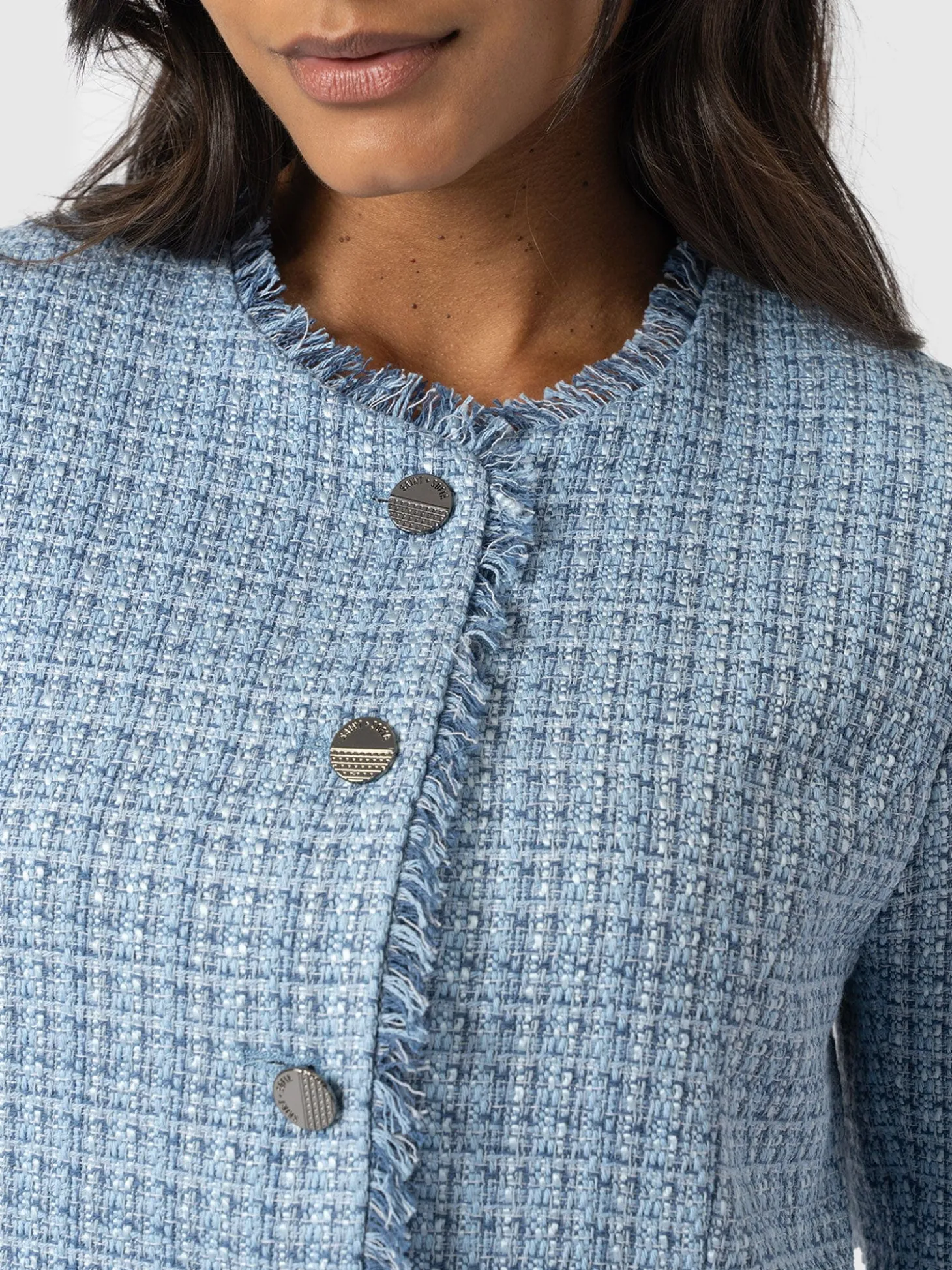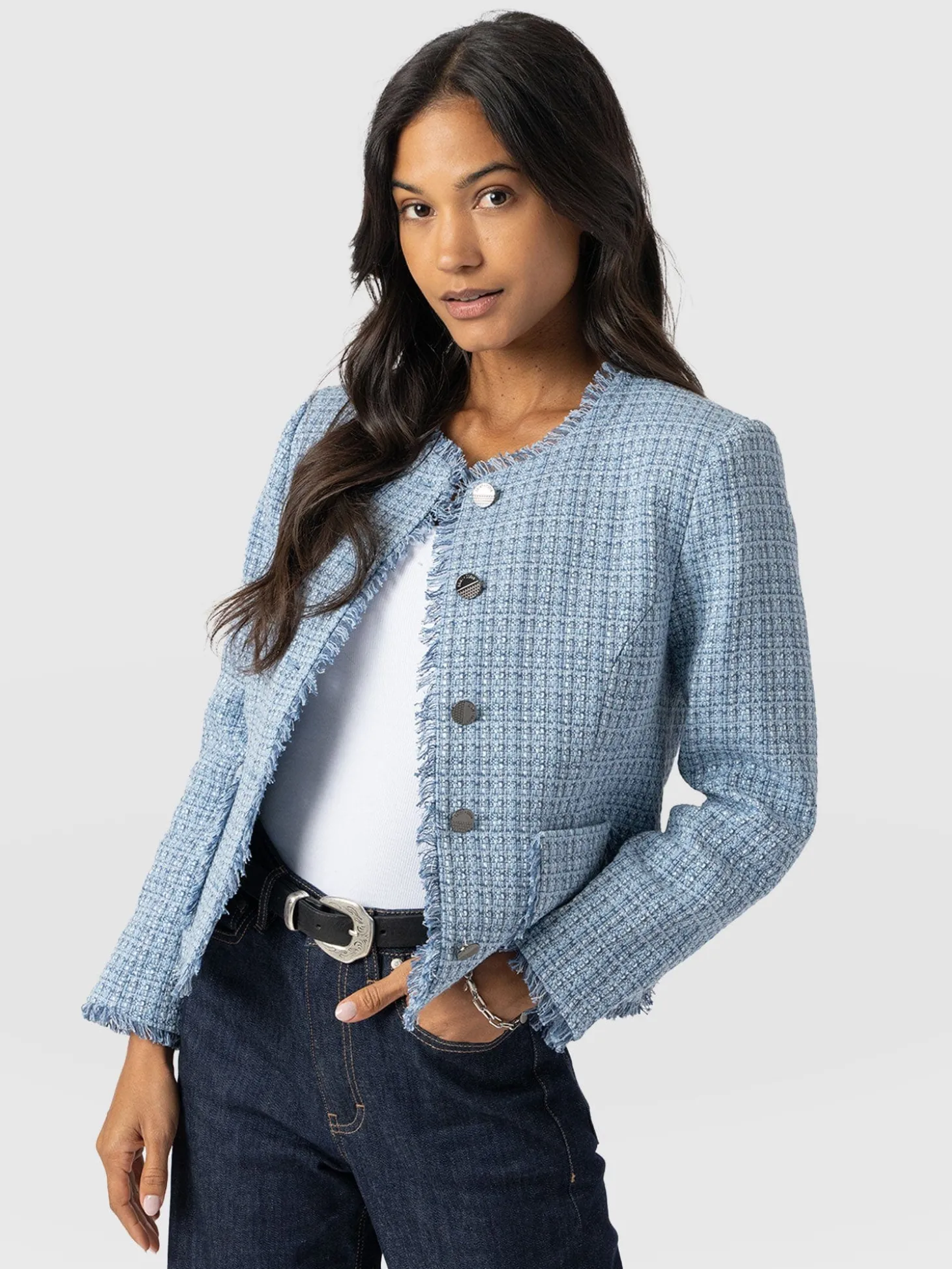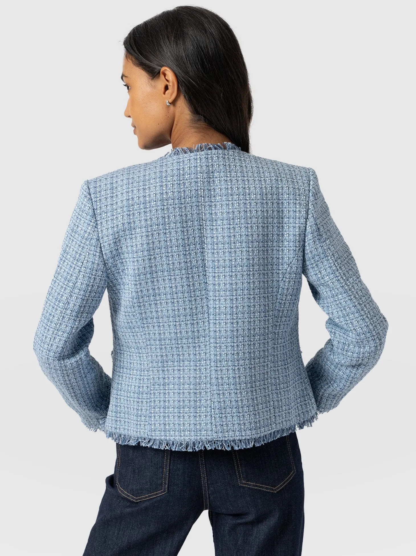 The Ashby Jacket is a fitted, button-through style with a chic edge. It’s masterfully handmade by our team of skilled artisans in Europe using a durable material that boasts a sophisticated boucle finish. At the trims, frayed hems help to add a distressed edge for a more contemporary look. Style yours with a pair of tailored trousers for the perfect evening look this season.