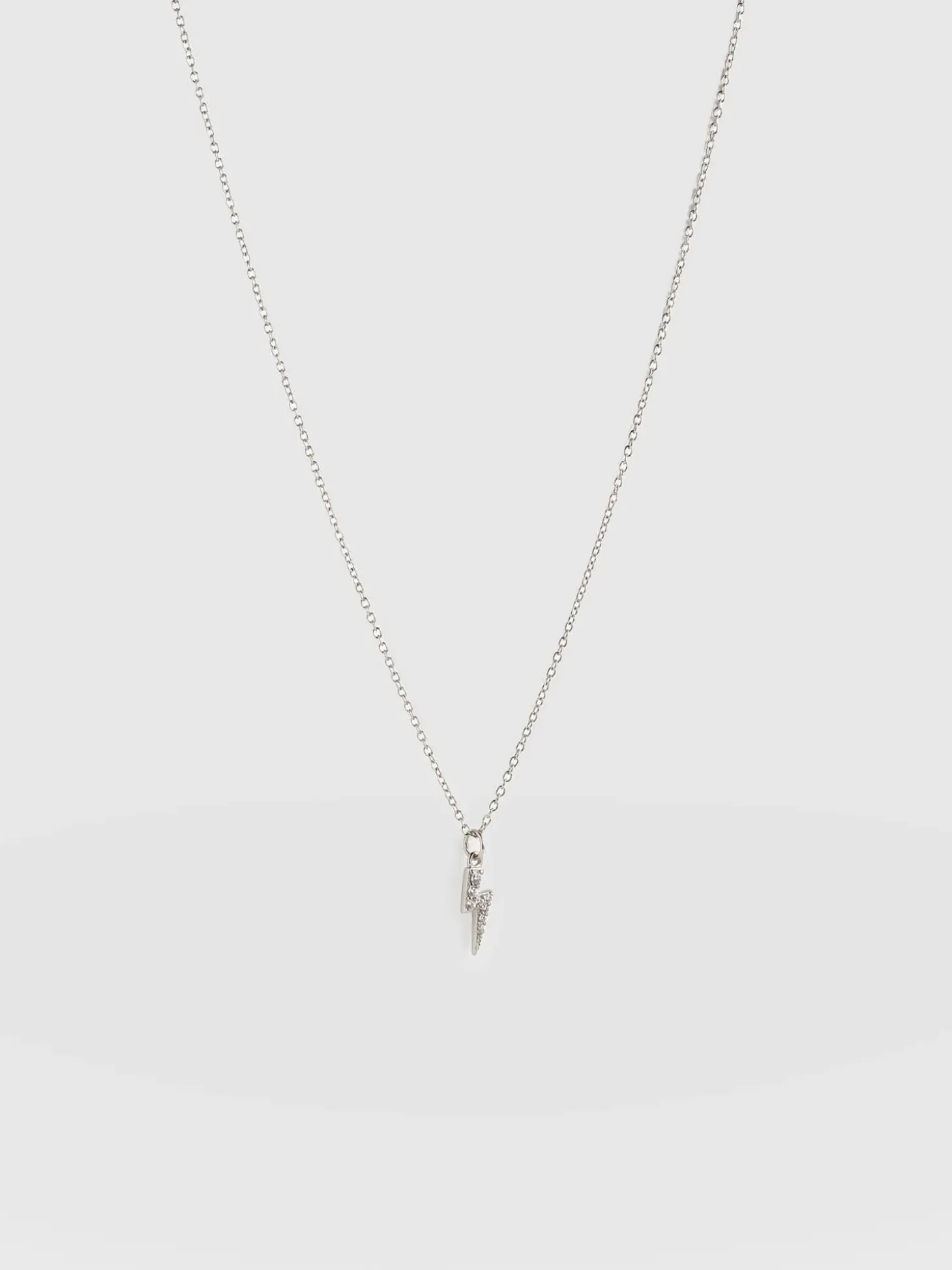 An elegant Astral Lightning Necklace in silver that can become a chic addition to your jewelry collection. Perfect for styling for work, weekends or as a gift for loved ones. This necklace features an elegant lightning design, blending timeless silver style with a touch of sparkle. Each necklace is handmade to guarantee precision and a quality that will last for years to come.
