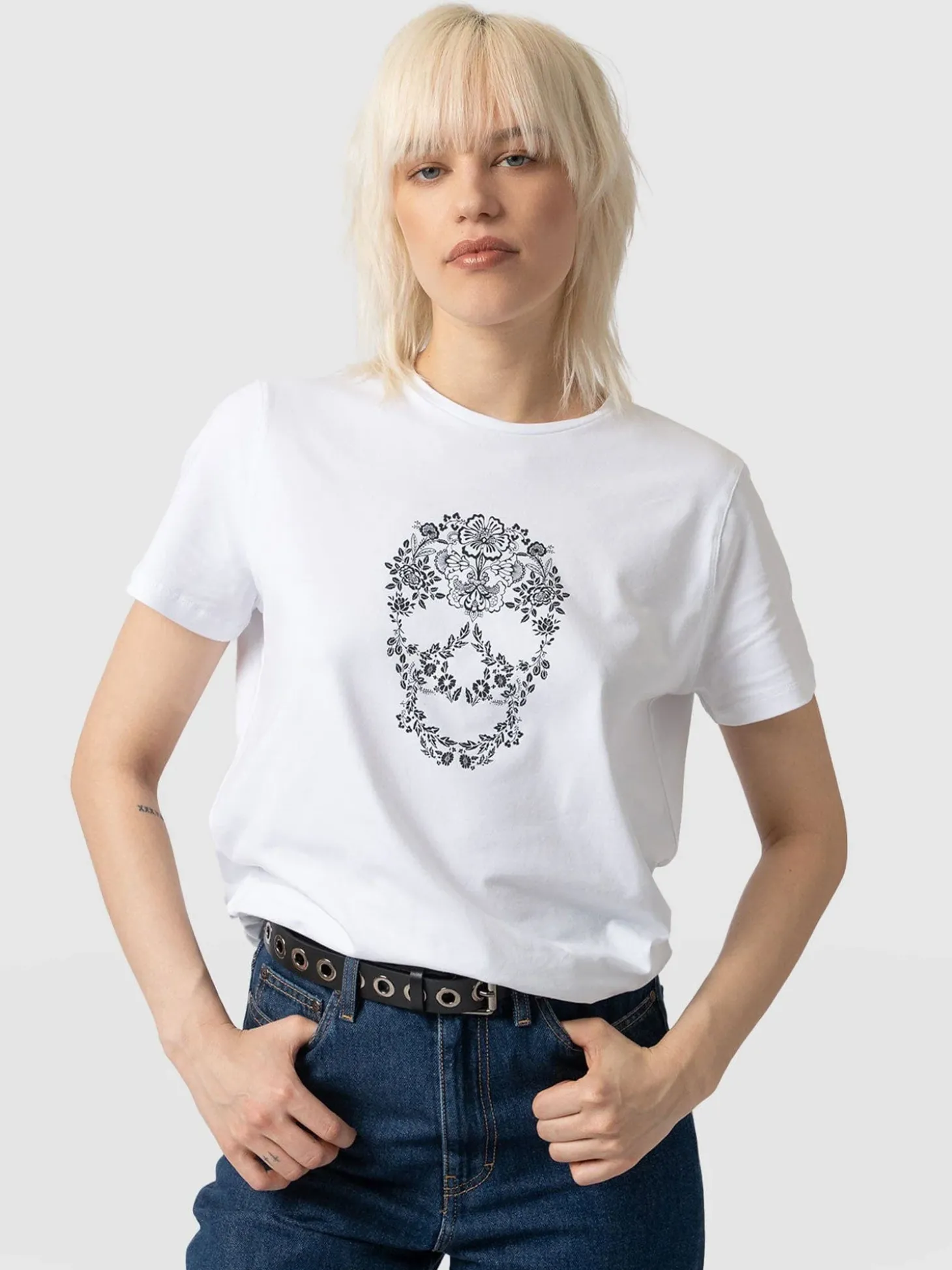 An easy boyfriend tee in white with a floral skull print design. Relaxed, loose fit. Soft and smooth handfeel that’s gentle on the skin. Handmade with the softest organic cotton in our studios in Europe for the perfect fit and feel that’s true to size. Pair it with jeans, shorts or a skirt on warmer days with sandals or slides.