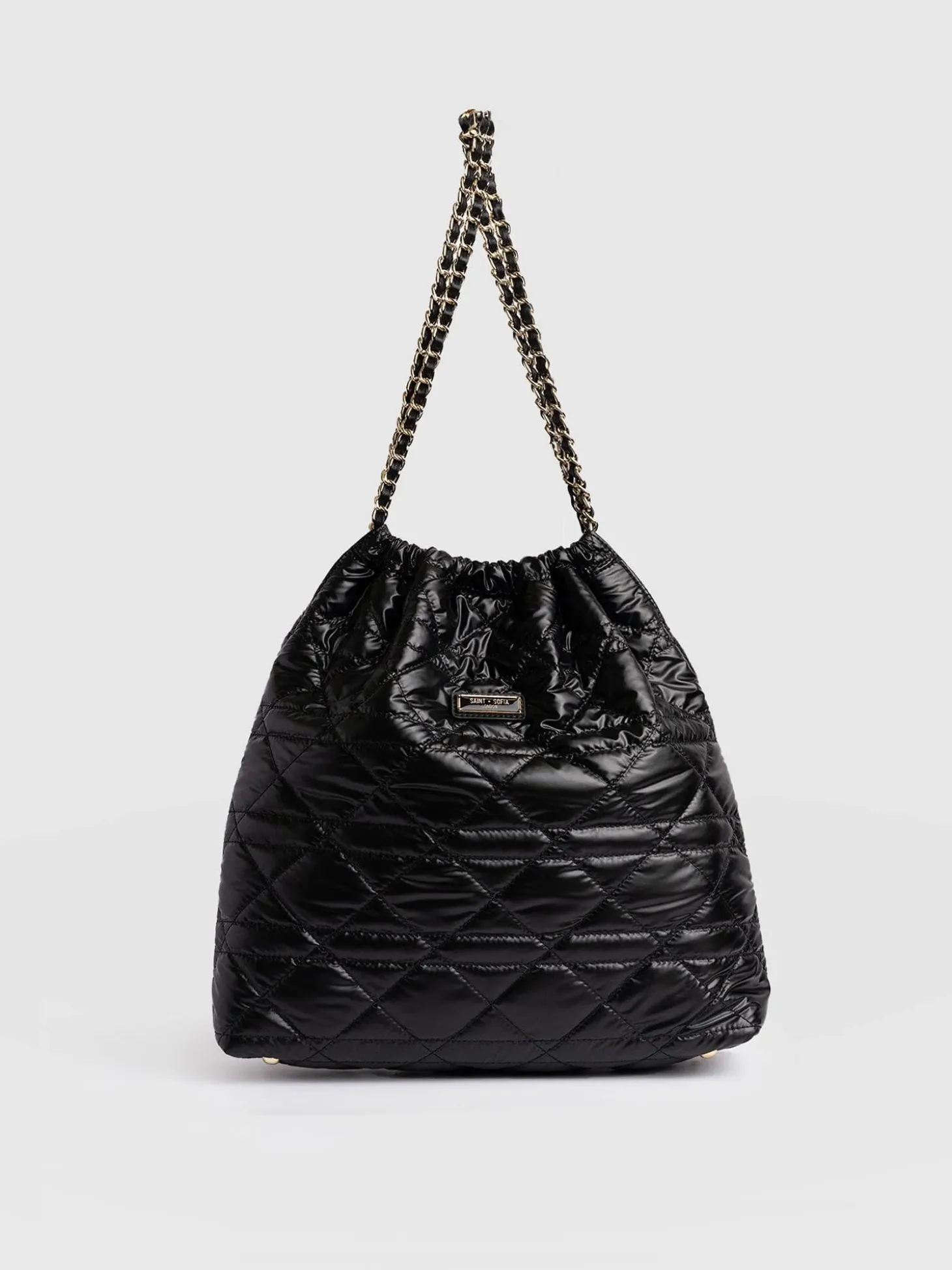 Take a classic tote bag, add a contemporary drawstring closure, and you’ll create the Camilla Bag. This new design is handmade from glossy nylon and textured with a quilted finish. At the top, a gold chainlink strap fastens over your shoulder and adds a glimmering edge to the chic silhouette. Inside, you’ll find plenty of space to store all your essentials and a zipped pocket for your prized possessions.