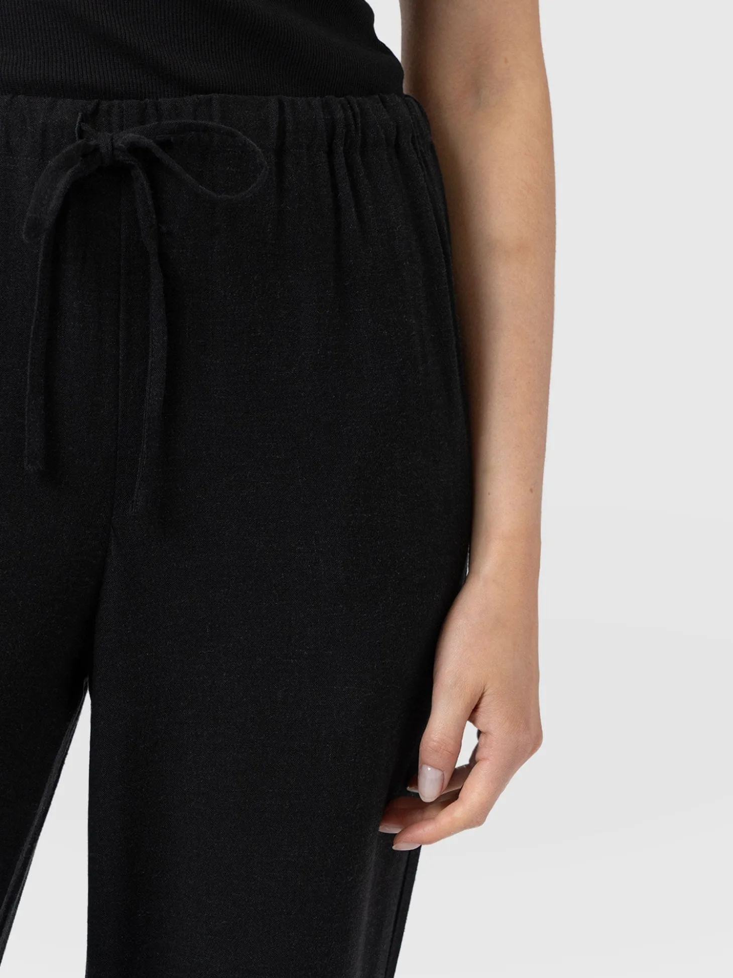 The Corinne Pant in black is a lightweight linen-blend design shaped to a wide-leg silhouette and topped by an adjustable drawcord waistband. Designed with warmer weather and beachside getaways in mind, they’re perfect for keeping you cool when the sun starts shining. Each pair is finished by hand to ensure the highest quality finish and can be styled with the matching shirt or tunic top to create a resort-inspired co-ord.