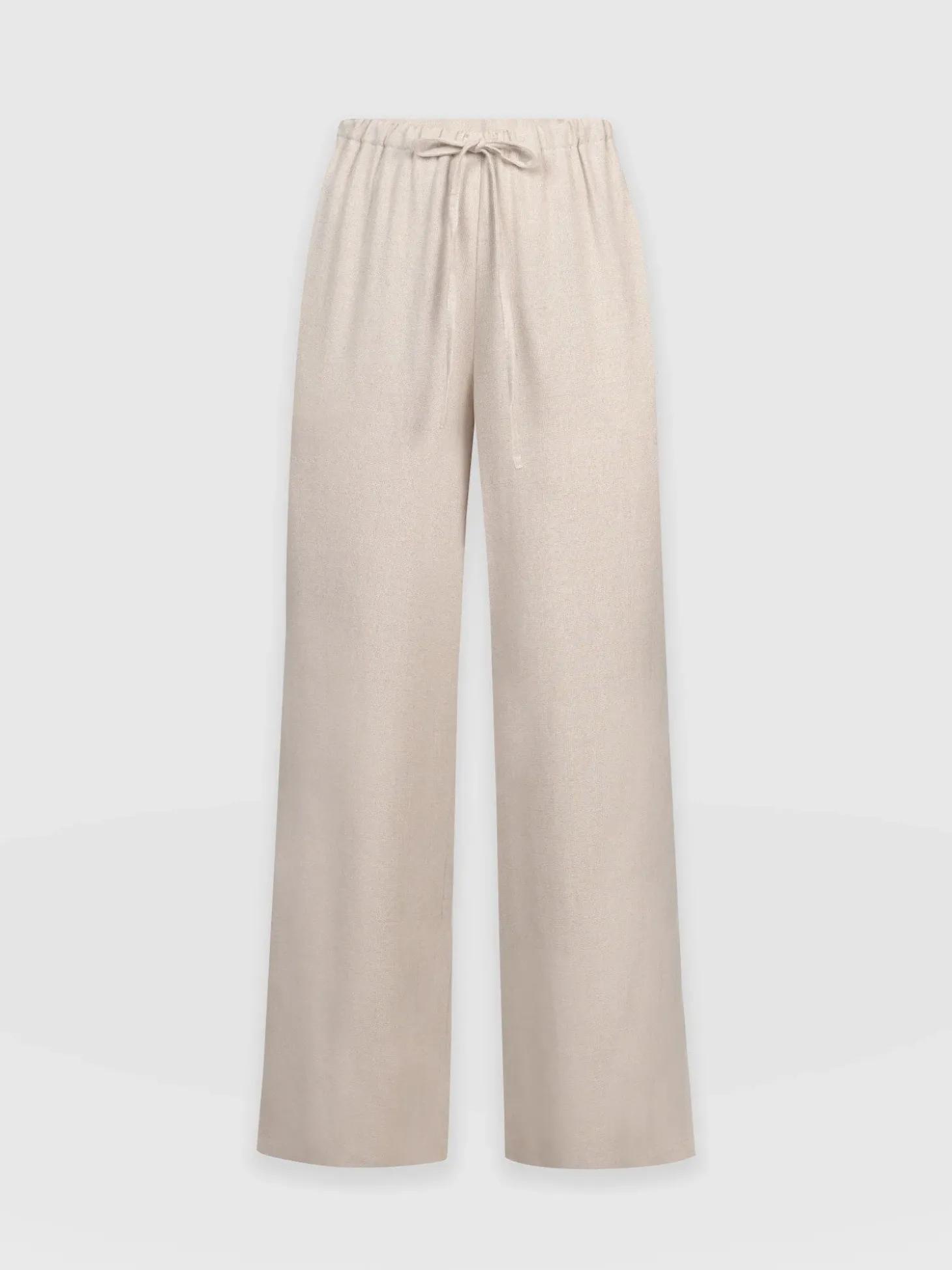 A linen blend pant in oatmeal, a stylish and versatile addition to your summer wardrobe. These linen pants boast a mid-waisted, straight-leg design with a drawcord waistband for ultimate comfort. The oatmeal colourway complements the linen blend material, making these pants perfect for both casual and classic looks. Style them with the matching Corinne Top for chic and effortless style. Alternatively, pair them with the Rib Cami in yellow citrine and Sutton Slides for a laidback holiday outfit.