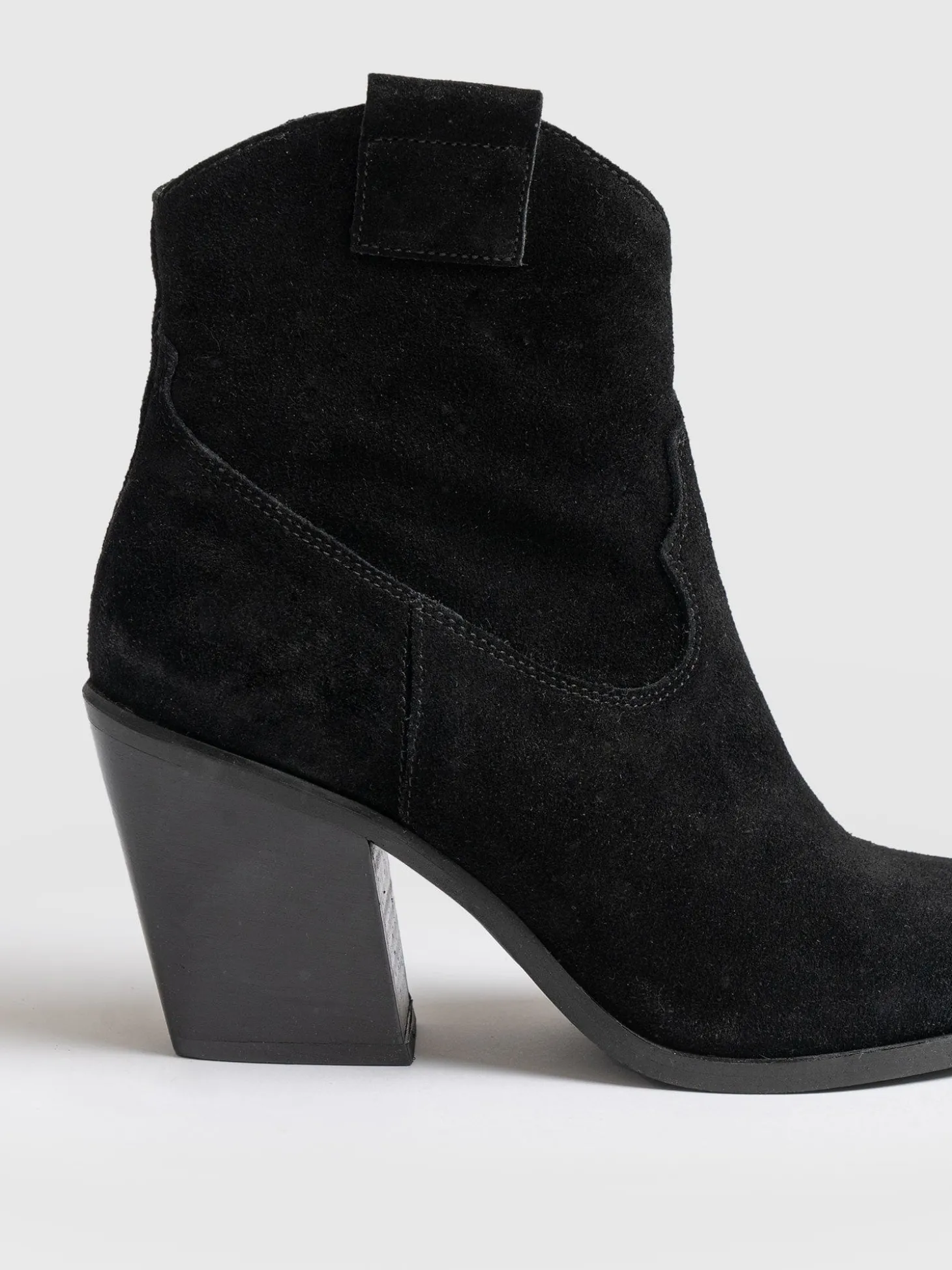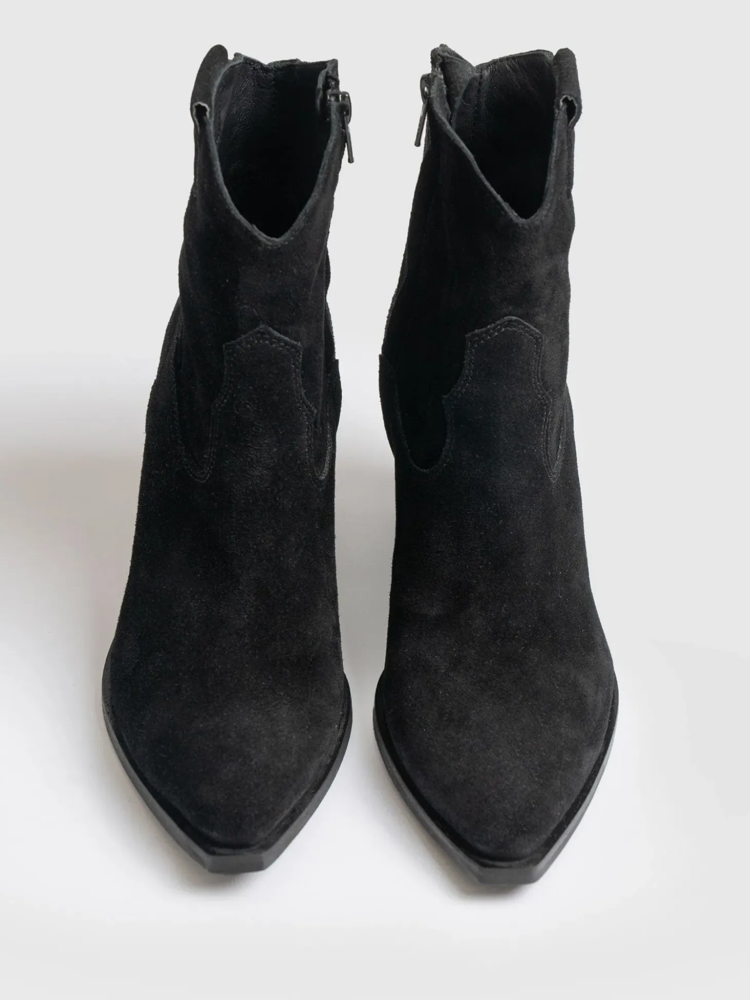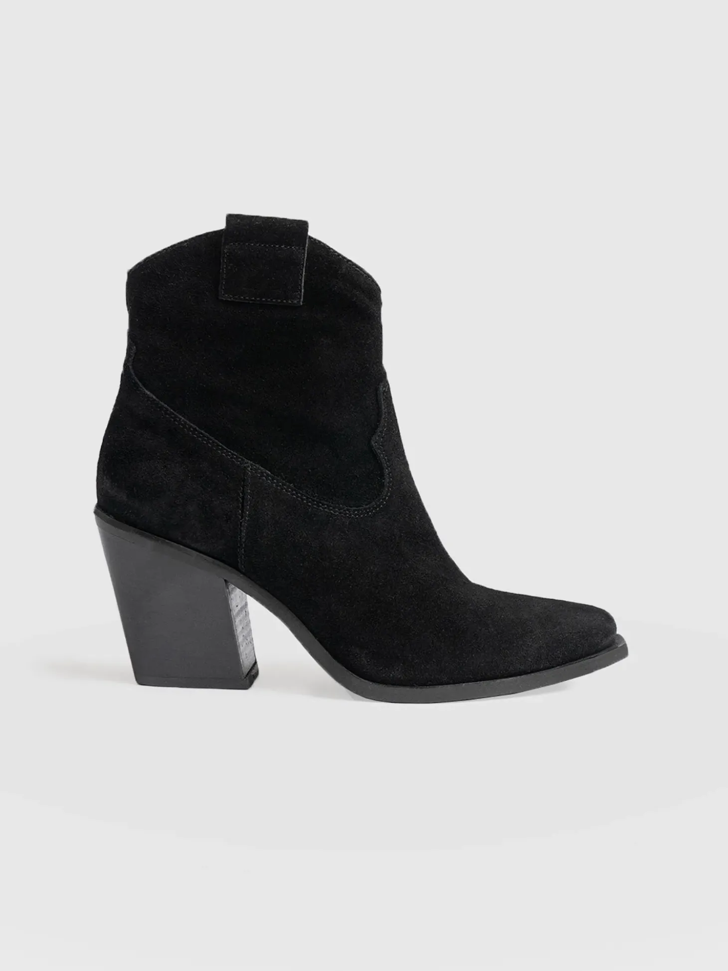 The Dallas Boot in Black is a classic ankle boot with a western style. Each pair is hand made with a soft suede and finished off with discrete stitching. Immediately comfortable as a slimline ankle boot with pointed toe and chunky heel, this on trend shape works well with anything from dresses, to skirts or jeans.