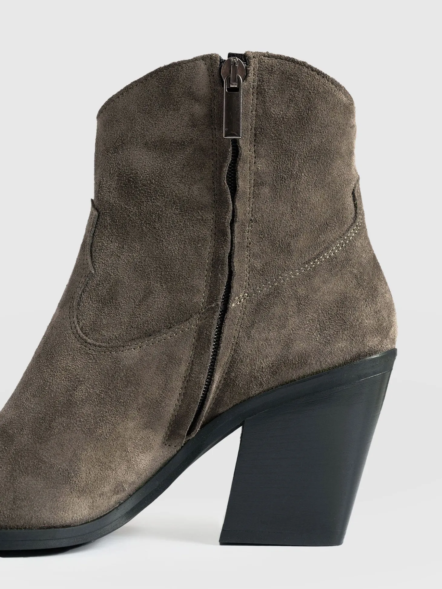 The Dallas Mid Boot in taupe is a classic ankle silhouette inspired by Western style. Each pair is handmade using soft Italian suede and finished with discrete, tonal stitching along its panelled frame. Immediately comfortable, they boast a slimline design with a pointed toe and chunky heel. Wear this playful shape to your first rodeo or your Sunday brunches with anything from dresses to skirts and jeans.