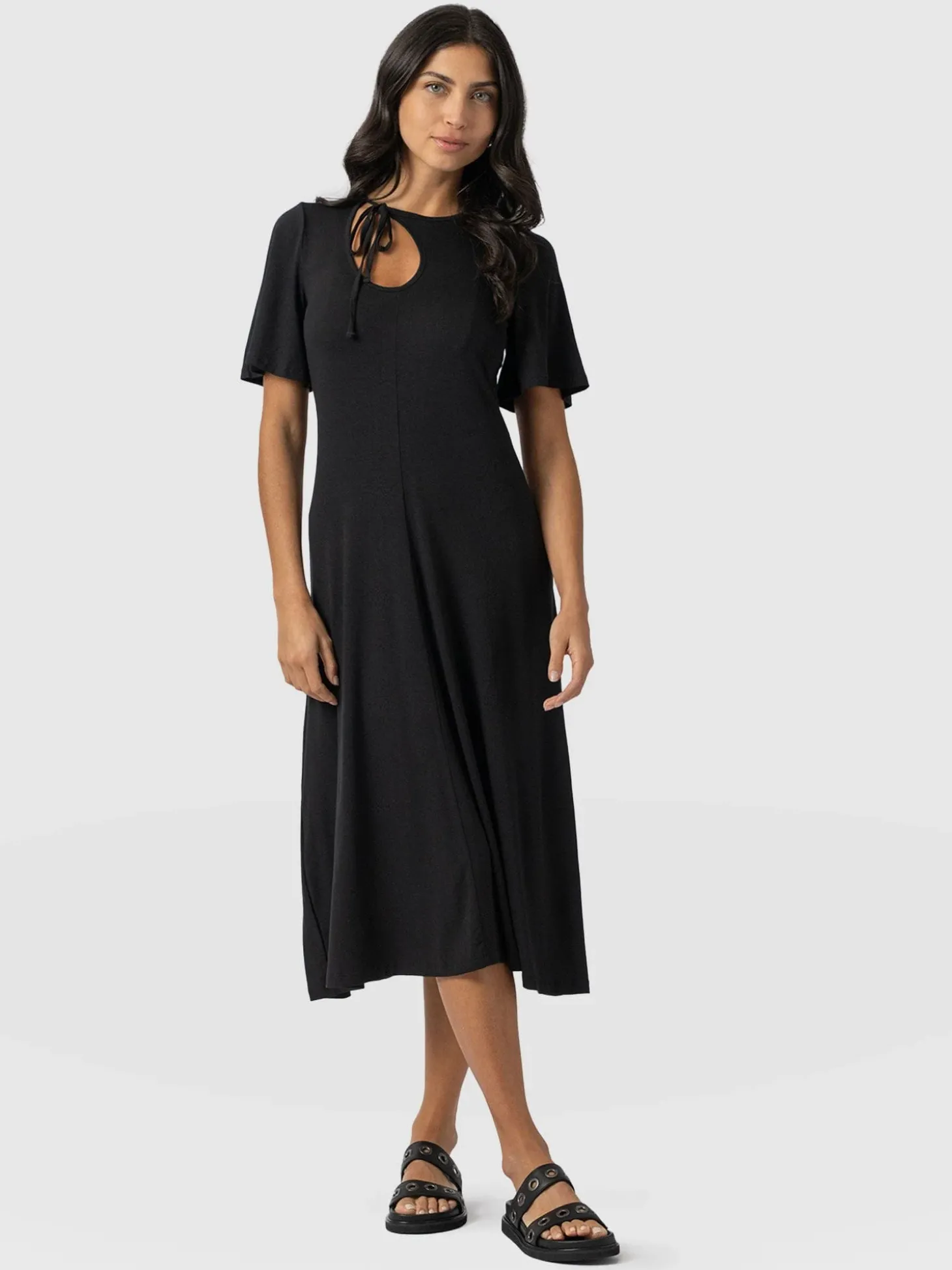 A sleek and elegant black dress, the Freya Tie Dress features a stylish cut-out and neck tie detail that adds a touch of femininity to your look. With flutter sleeves and a midi length, this dress is perfect for any summer occasion. The center front and center back seam create a flattering fit and flare silhouette that accentuates your figure. Made from high-quality materials, this dress is both comfortable and stylish. Style it with a pair of bright Sutton Sandals for a pop of colour, add statement earrings for a complete look.