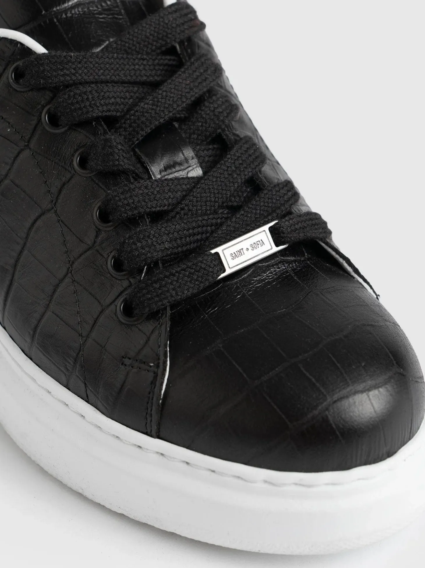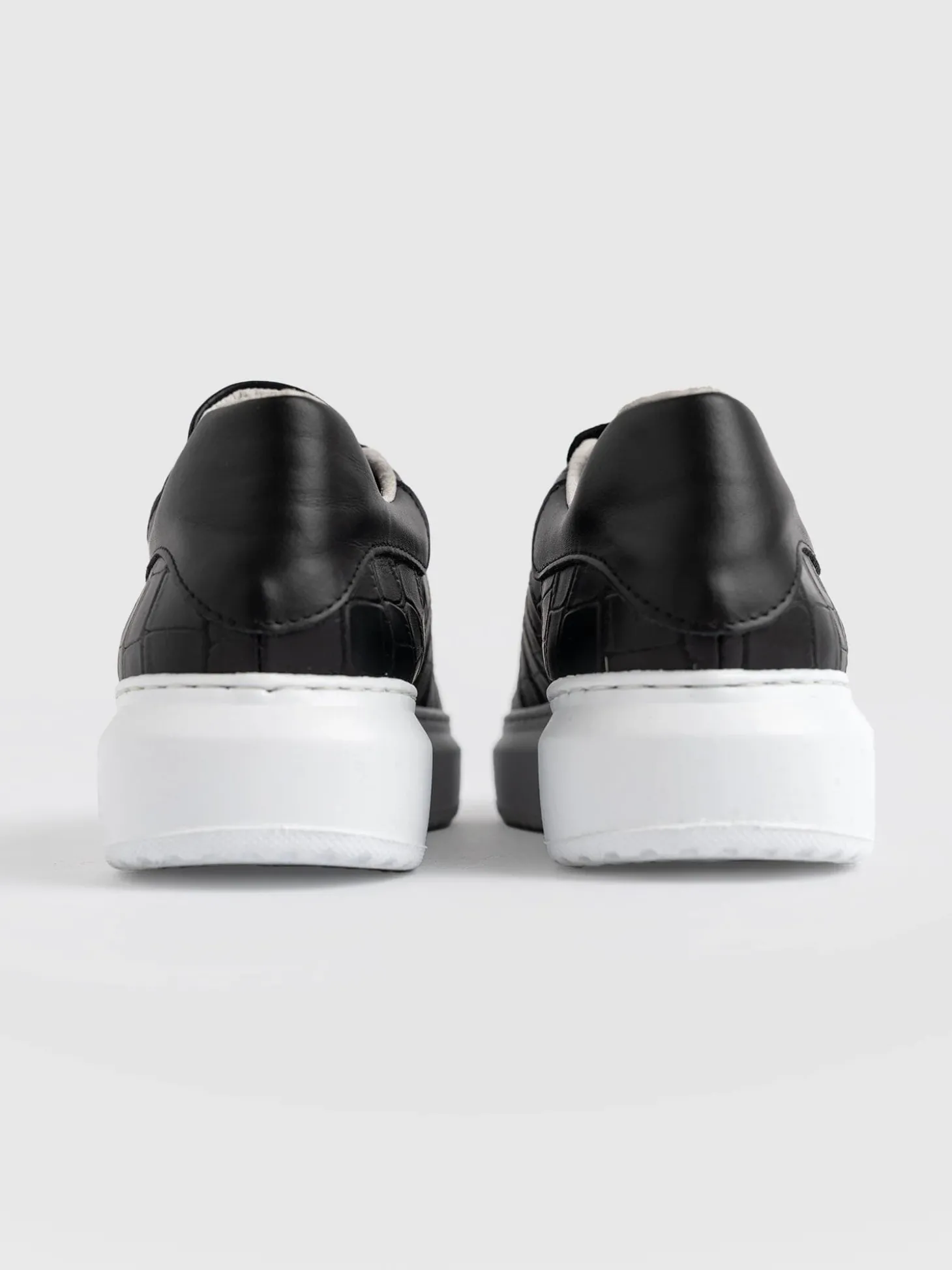 A classic platform sneaker in black with crocodile print detail. They’re made with the softest natural leather and are immediately comfortable with a wider fit and a soft rubber sole. We design our sneakers in London and make them in Portugal with a family owned workshop that’s been making shoes since 1949. We only make small batches at a time and finish every detail by hand. Pairs effortlessly with leggings, wider leg pants or jeans.