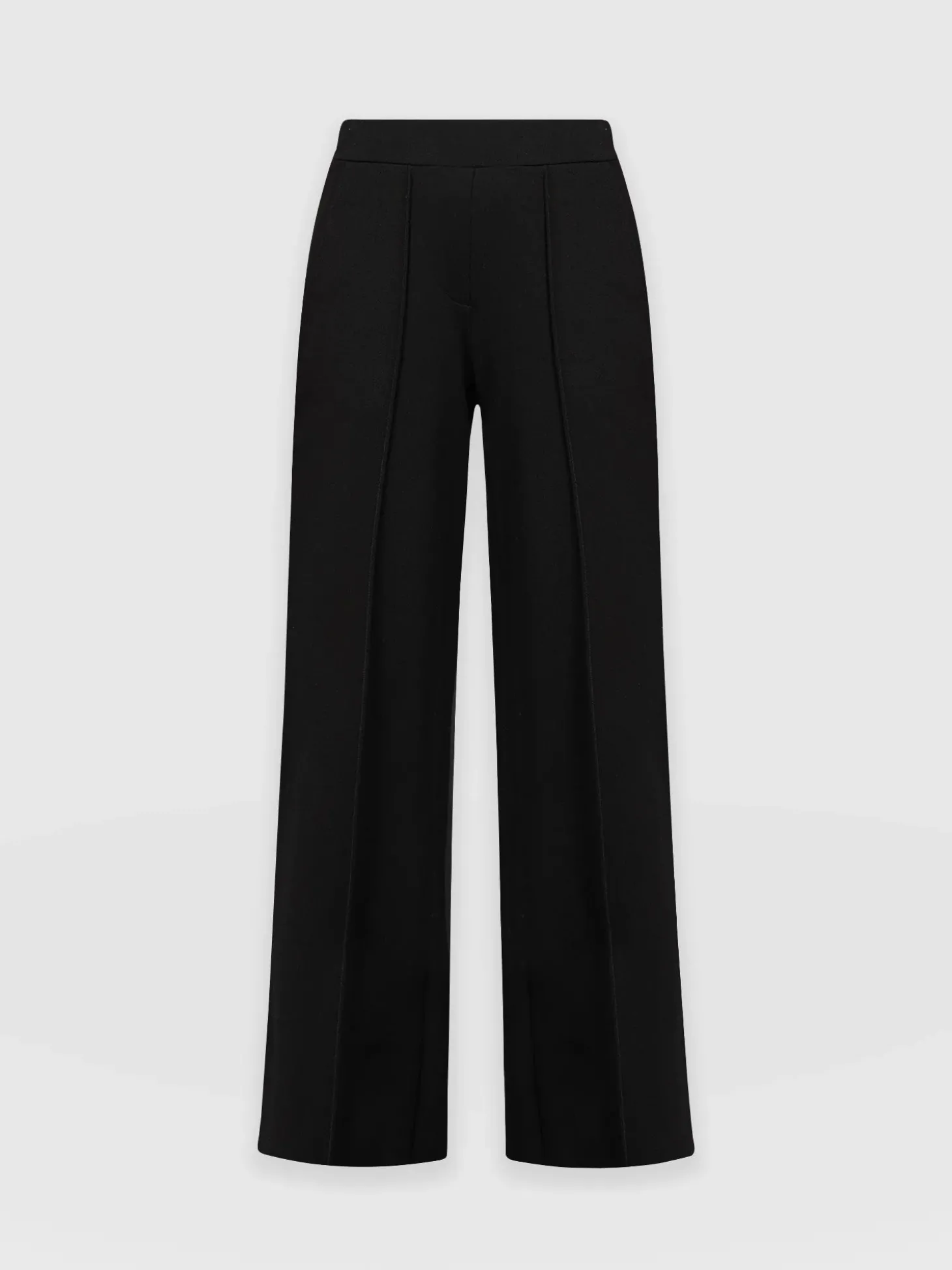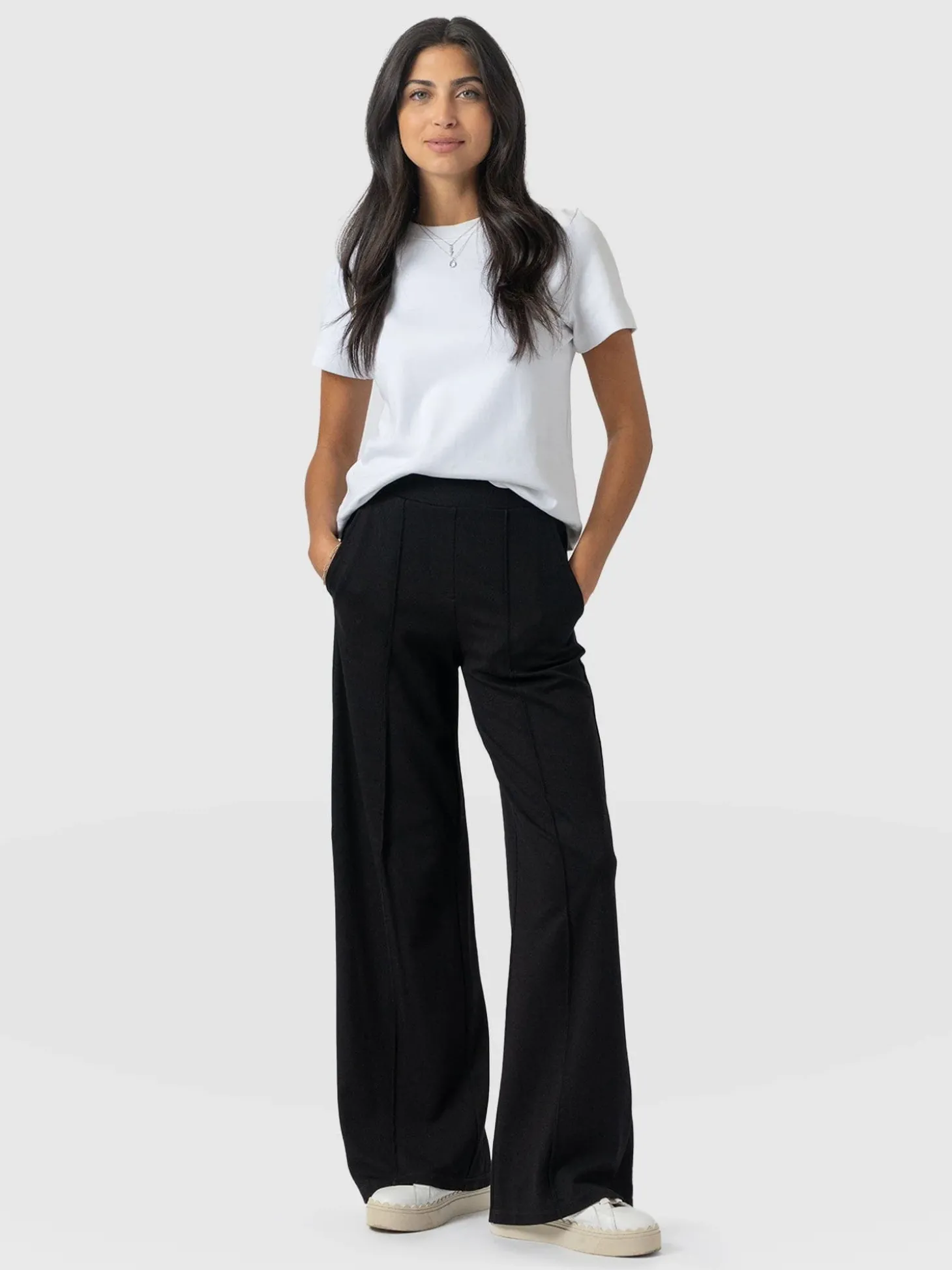 The Keller Wide Leg Pant in black is a sleek and stylish addition to your wardrobe. These wide-leg pants feature a front pintuck and slant pockets for added detail. The flat front with elastic at the waist ensures a comfortable and flattering fit. The versatile black makes it easy to pair with any top or accessory. Whether you dress them up with heels and a blouse or keep it casual with sneakers and a t-shirt, the Keller Wide Leg Pant is perfect for any occasion.