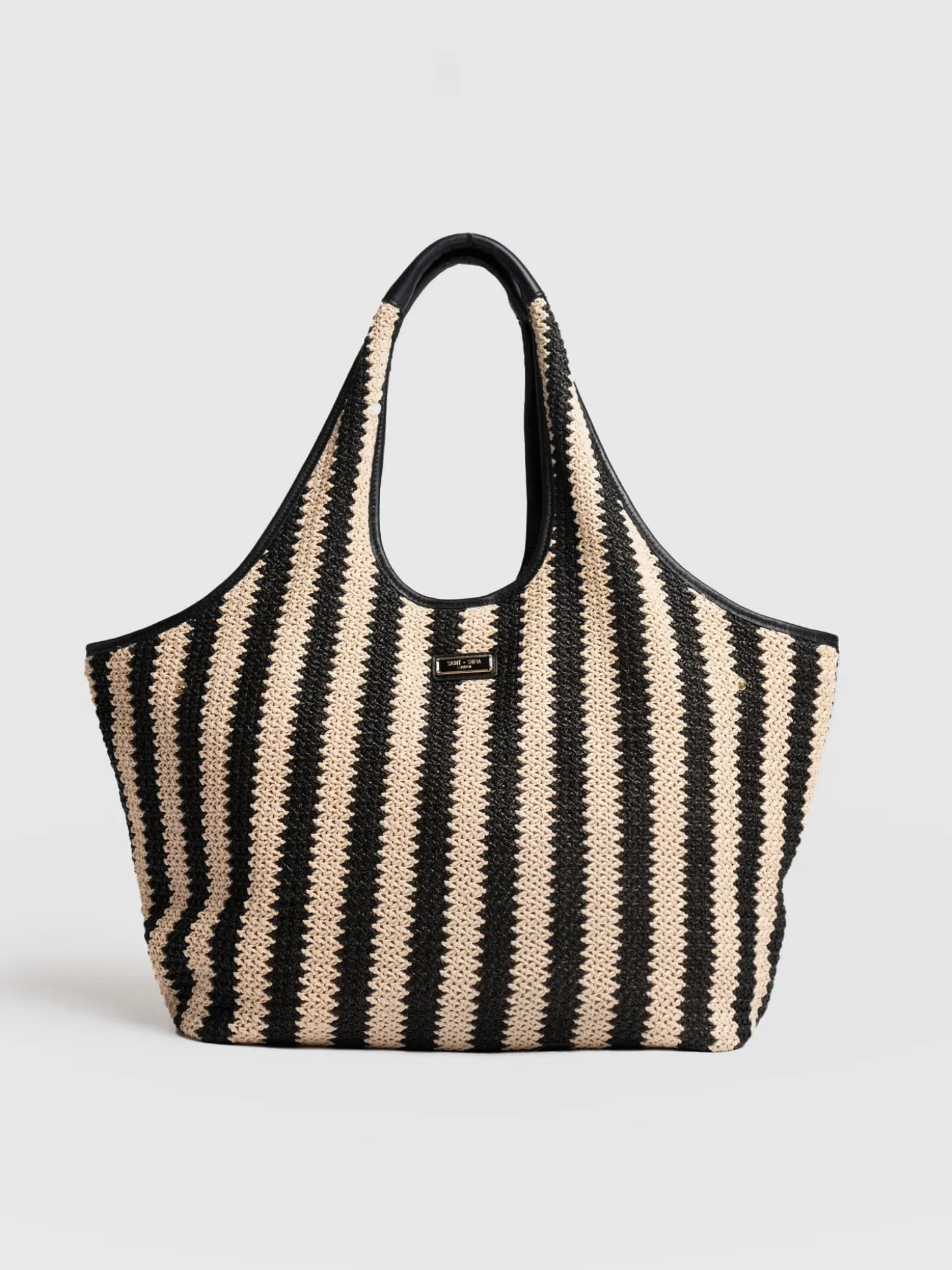 Large Stella Shoulder Tote Bag – Beige/Black Raffia