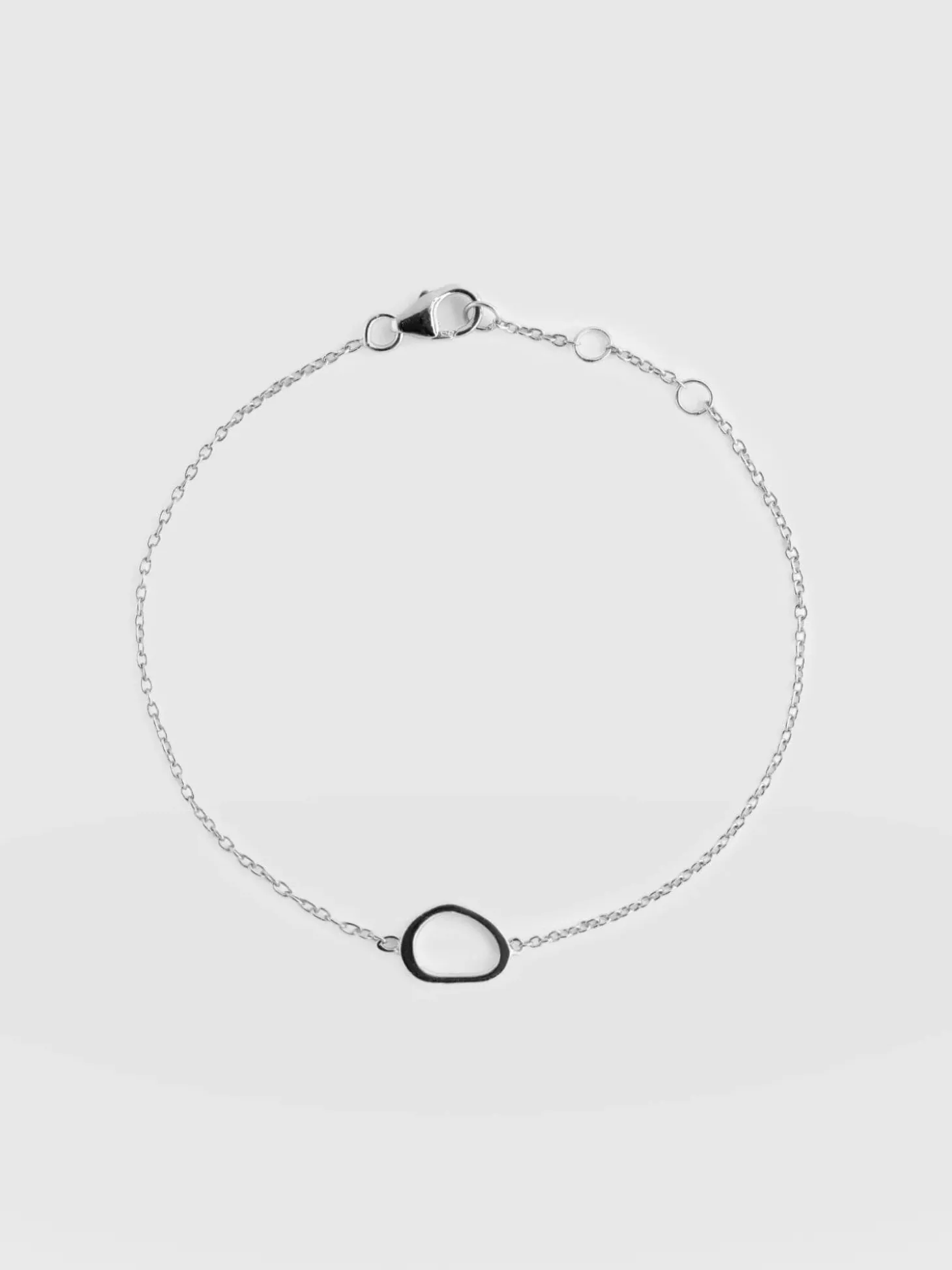 Our elegant Organic Open Oval Charm Bracelet in silver is a stunning piece that exudes natural elegance. The organic open oval charm, beautifully suspended from a delicate cable chain, adds a touch of unique charm to any outfit. Perfect for styling for work and weekends or as a gift for loved ones. For a complete and coordinated look, pair this bracelet with the matching earrings and necklace. Looks beautiful on its own or as part of a layered look.
