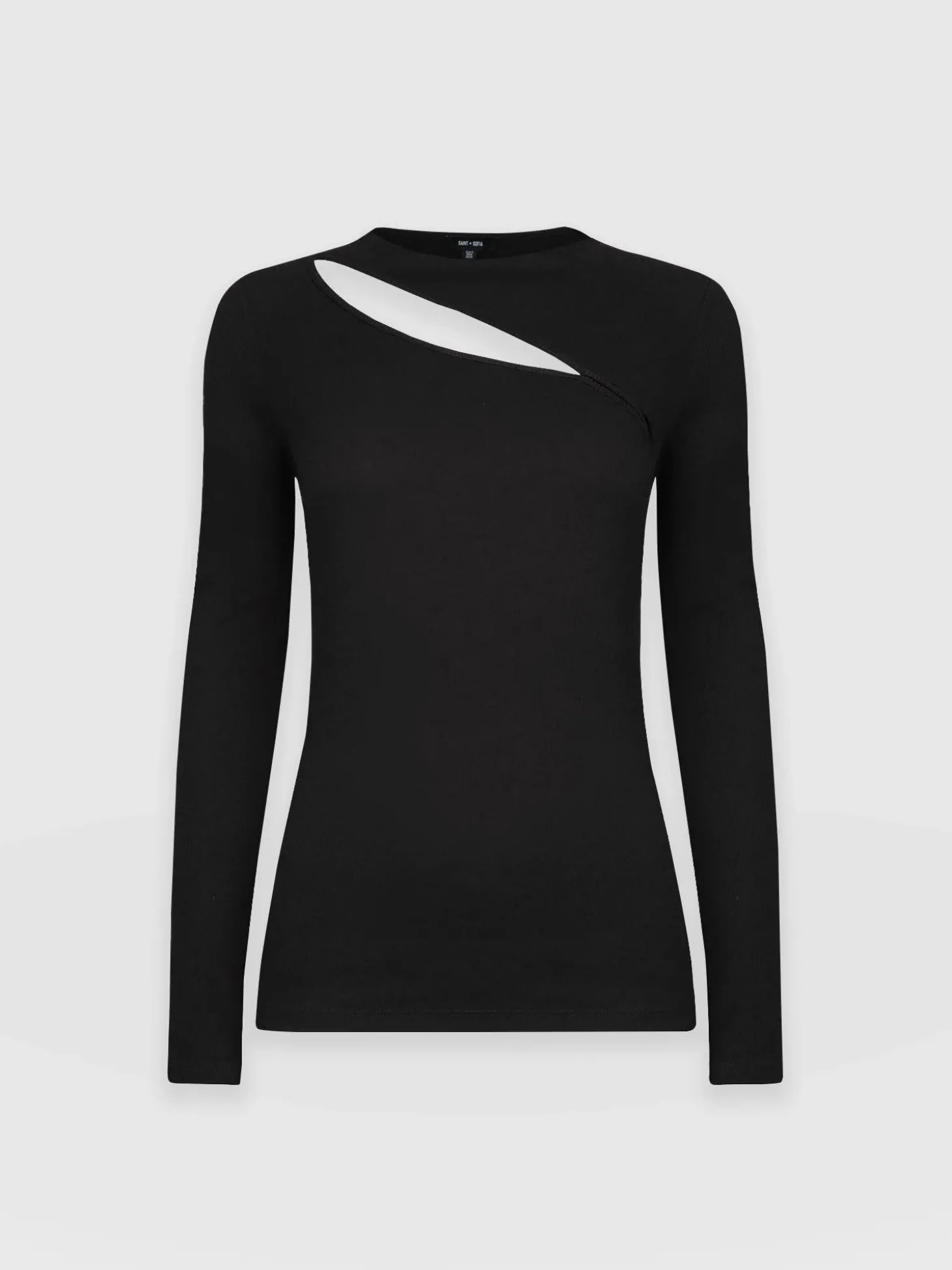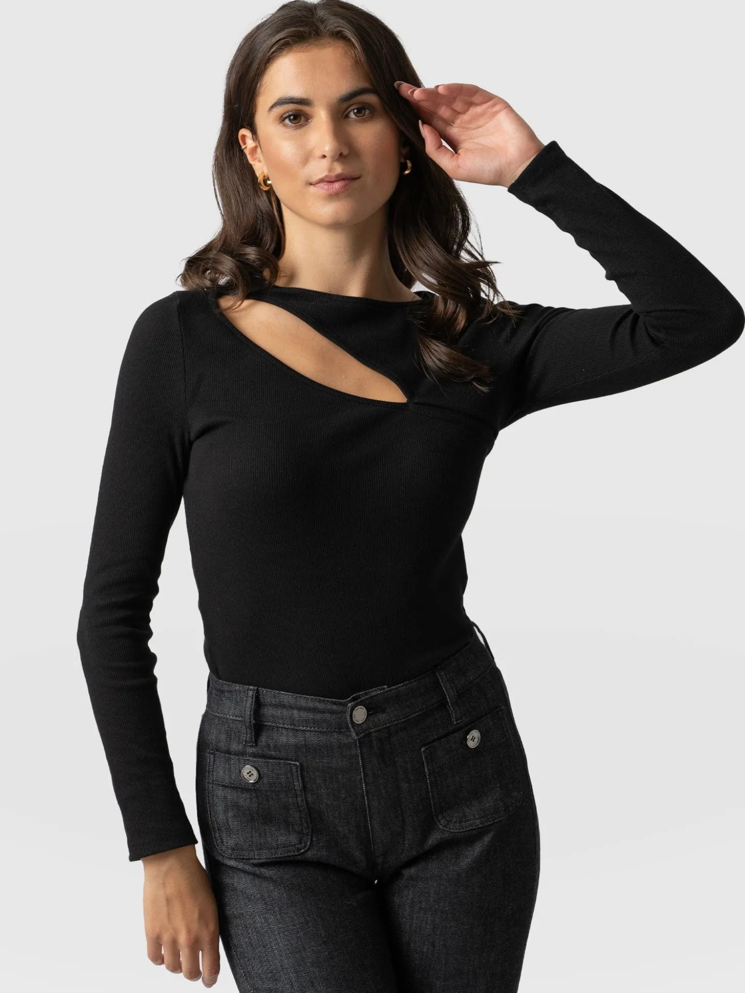 A soft, ribbed tee in black with long sleeves and featuring a cut-out detail. We gave this a figure flattering, slim fit and finished it by hand. We use the softest organic cotton from Europe and add a little elastane for stretch. Perfect for layering, pairs easily with jackets or blazers for a smart casual look. Each style is hand finished with discrete stitching in our studios in Europe.
