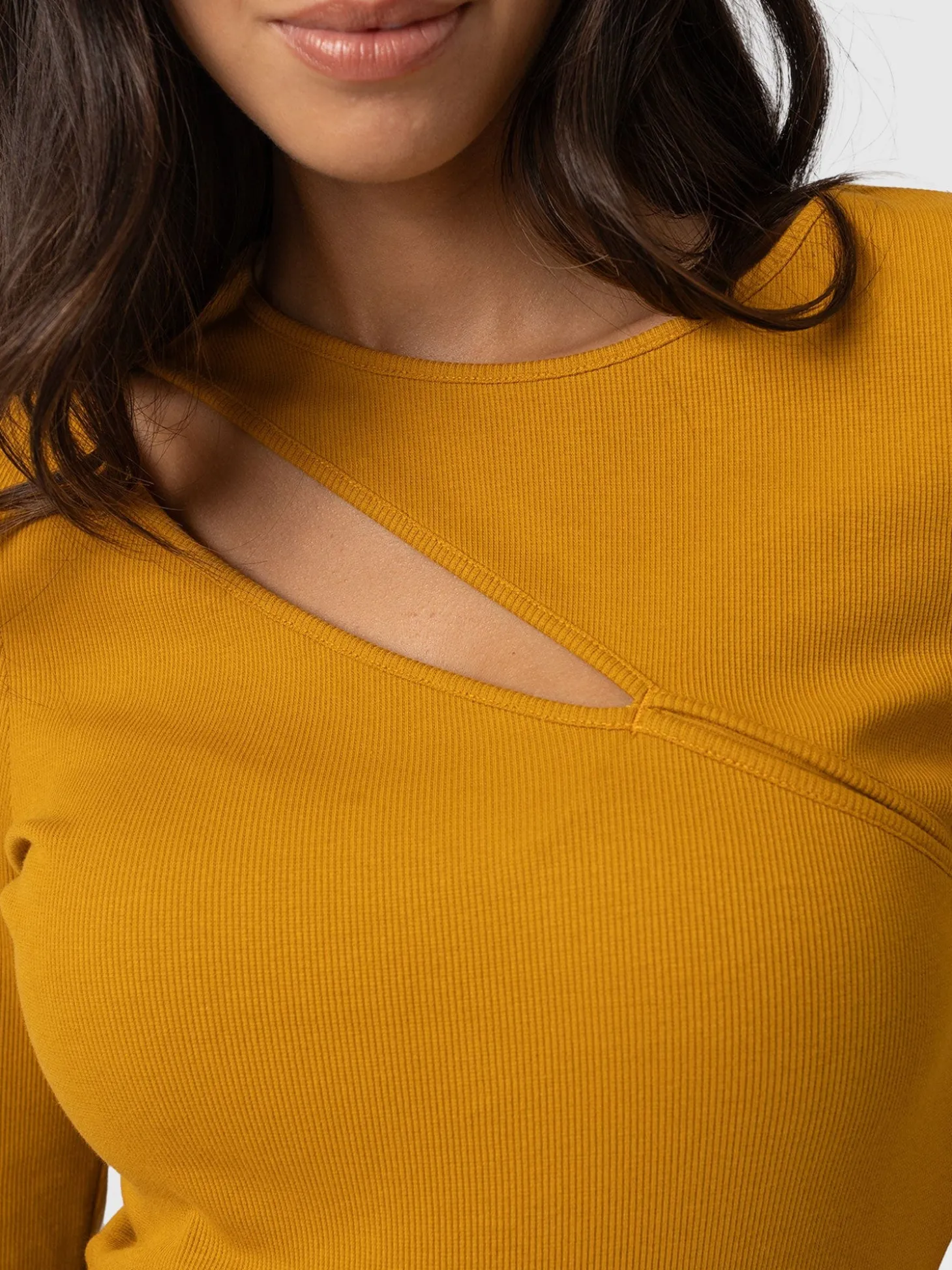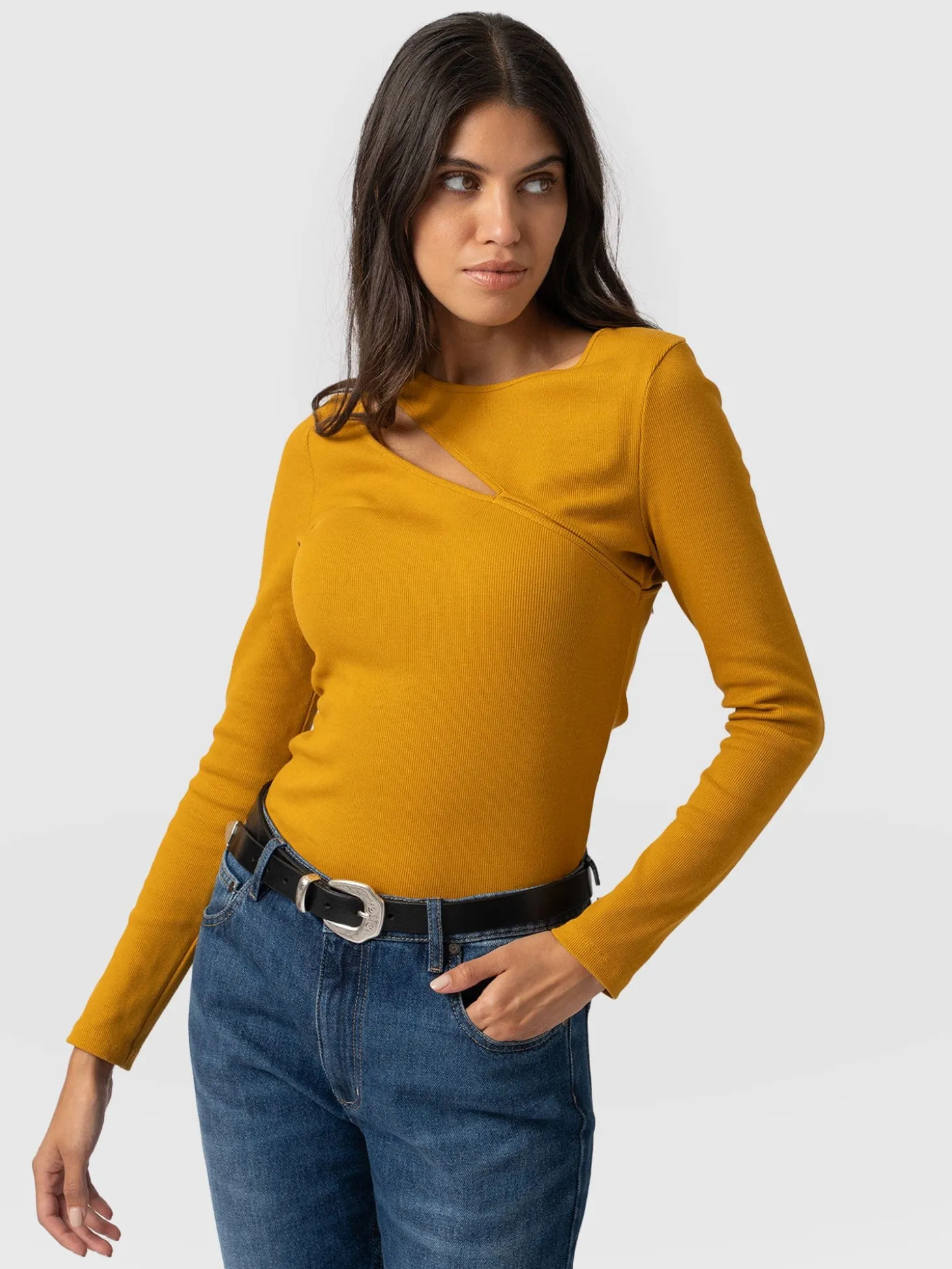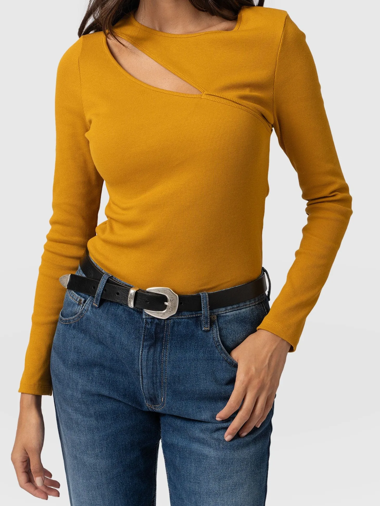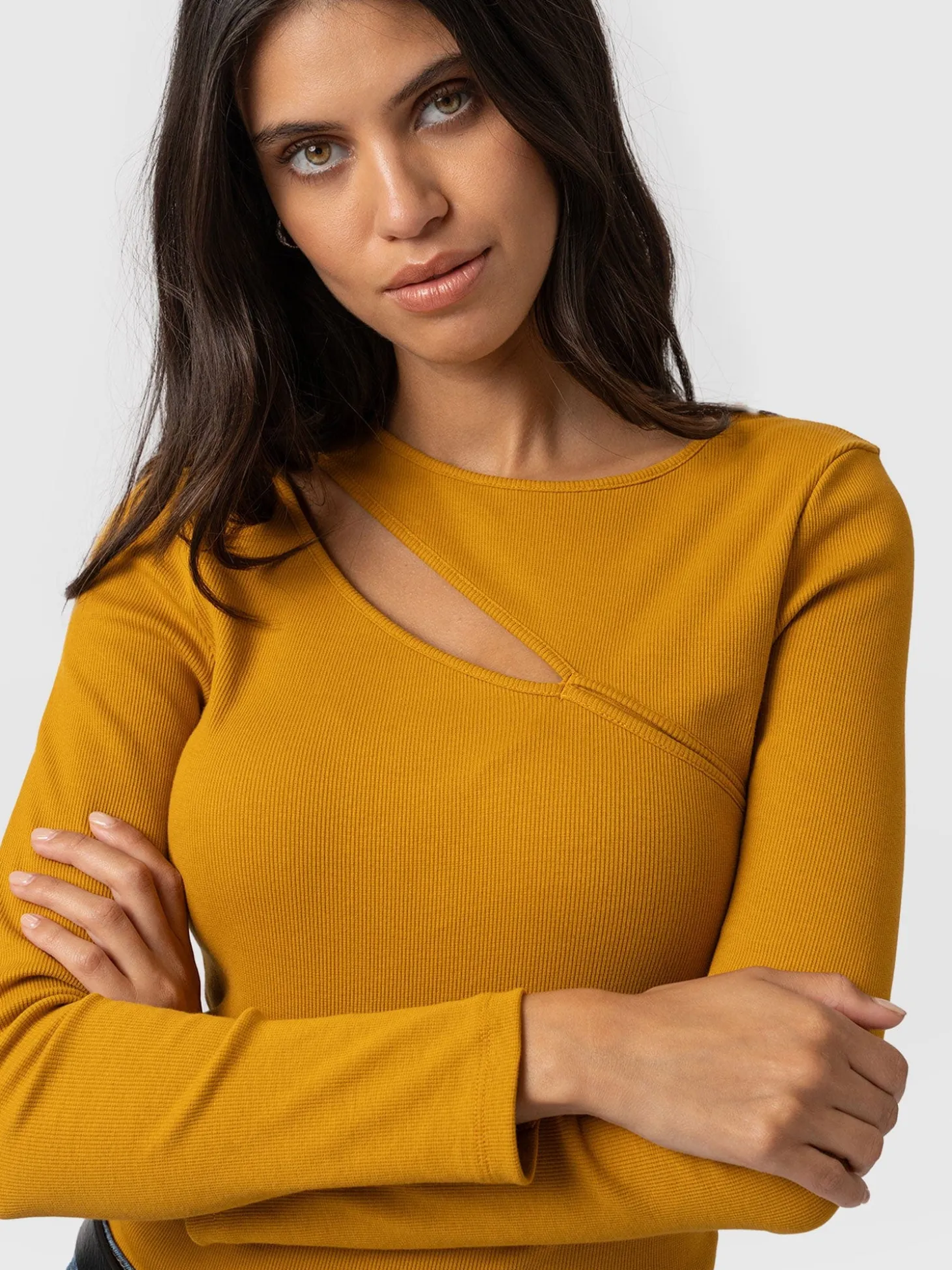 The Reveal top is a soft, lightly ribbed design in ochre masterfully handmade from smooth organic cotton and sliced with a cut-out detail at the chest. It’s topped by a round neckline and infused with elastane for a hint of stretch. We cut it to a figure-flattering, slim fit and finished it by hand to ensure the highest quality. Perfect for layering, easily pair yours with jackets or blazers for a smart casual look.