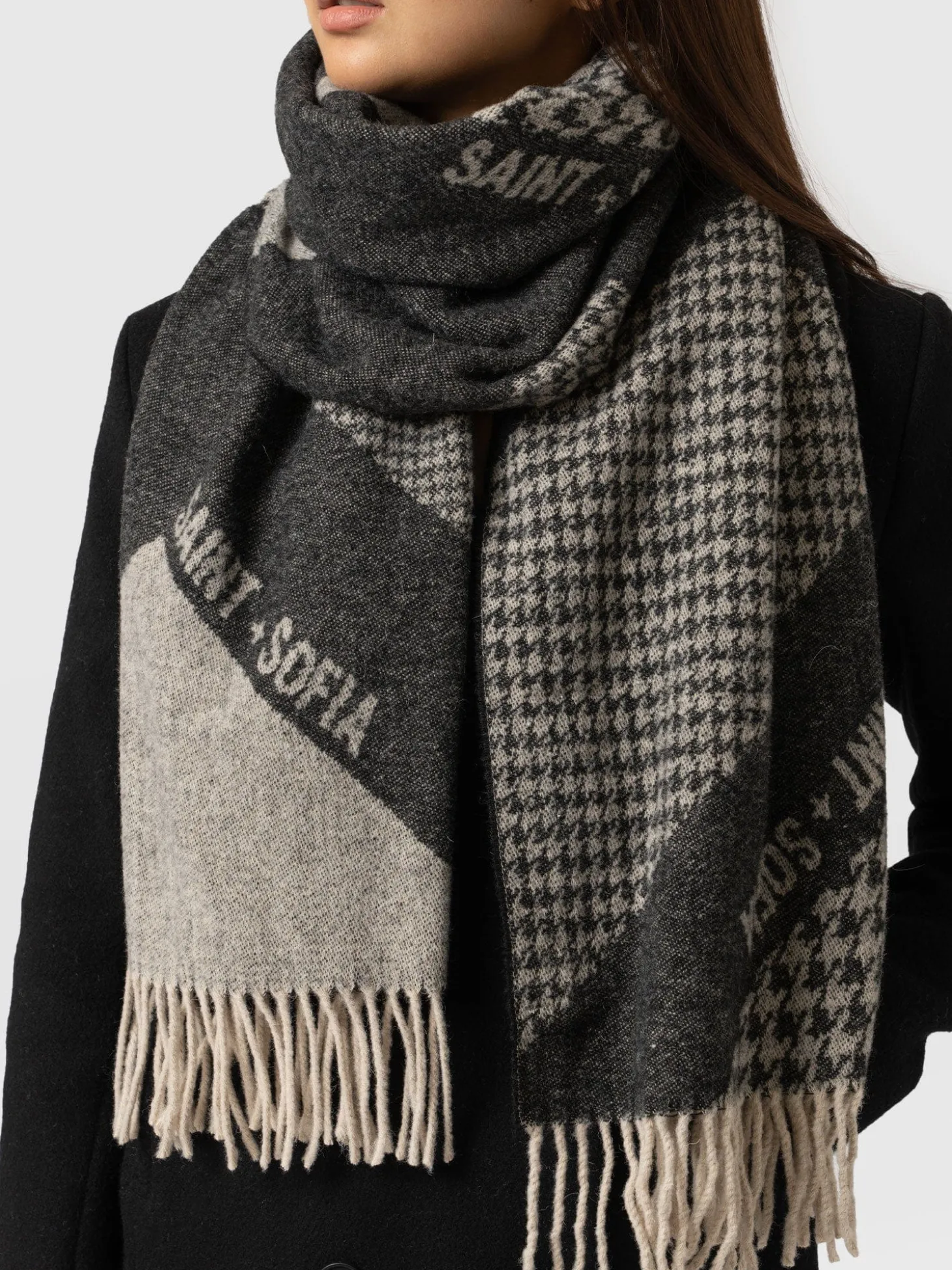 A beautiful hand woven scarf in wool, made on the shores of Lake Como in Italy. This Saint + Sofia Scarf in black and grey houndstooth pattern also features a subtle logo placement and can easily be styled on colder winter days. It’s made with a soft and warming wool blend. The generous length allows for all ways of wrapping.