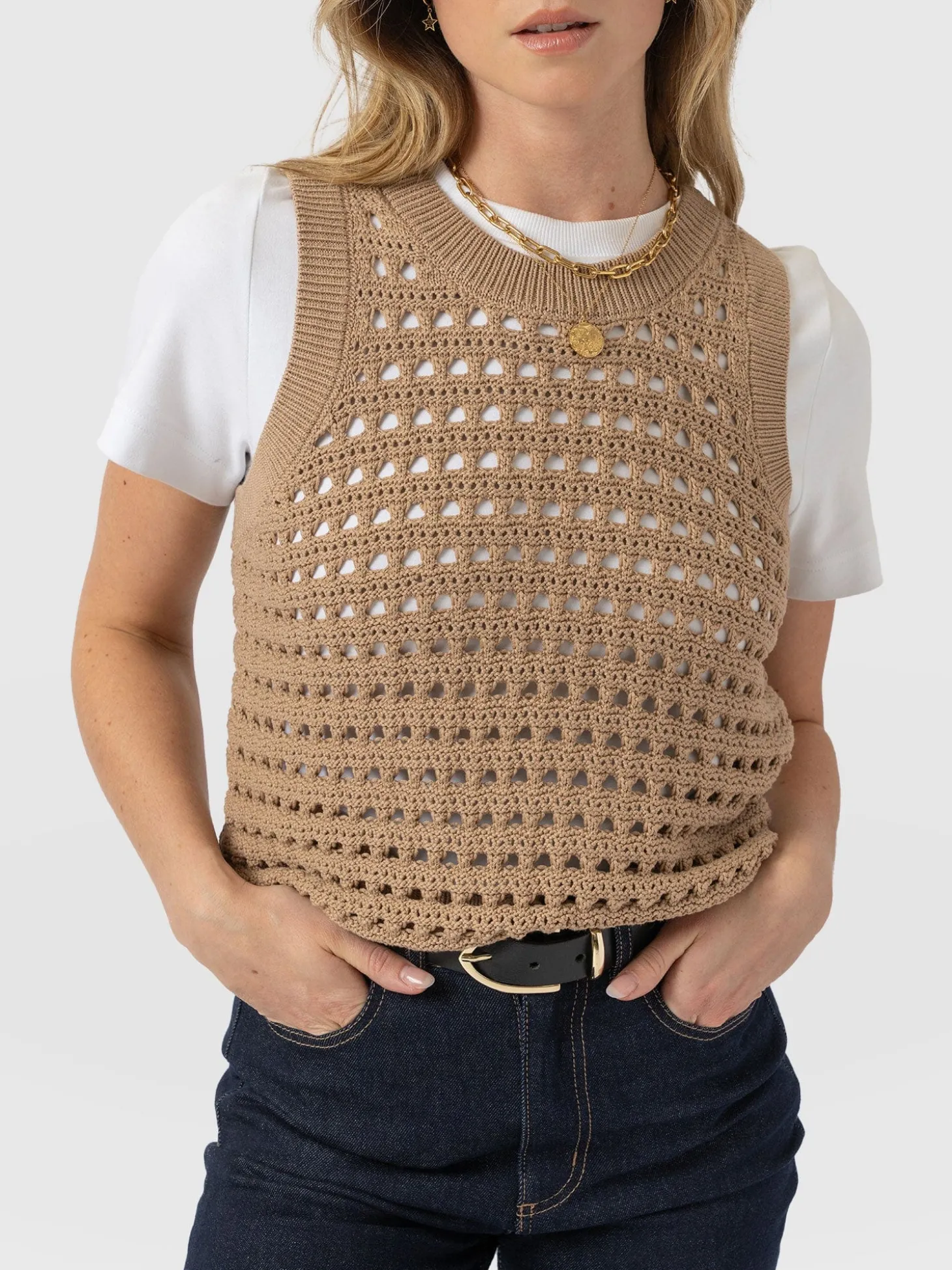 Built for layering, the Adler Sleeveless Knit in camel is perfect for those transitional months. It’s woven to an open-knit that creates a lace hole mesh texture and is cut to a sleeveless silhouette to leave the arms of your undershirt on show. Style yours with a white button-up and a pair of Maeva Skinny jeans, and let the ribbed hem cinch your waist.