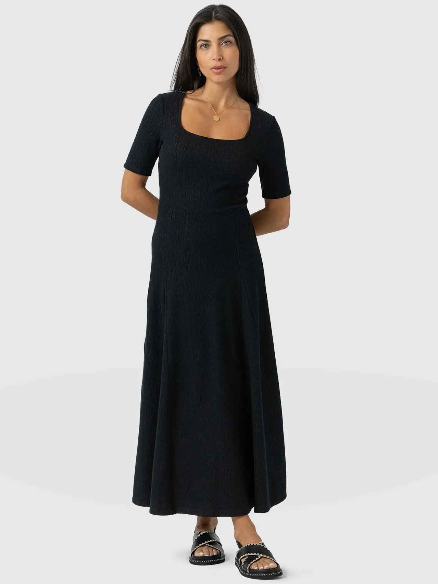 The Akia Short Sleeve Dress is a square neck design with a voluminous skirt that falls to a calf-grazing midi length. It’s handmade from stretch-infused organic cotton and features a textured bodice with short sleeves. At the waist, it flares into a breezy skirt stitched with godets for added fullness. Style yours with sandals on warmer days, or layer under a jacket when the temperature drops.