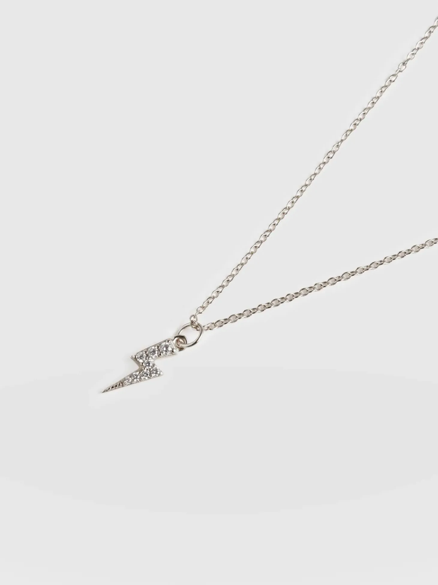 An elegant Astral Lightning Necklace in silver that can become a chic addition to your jewelry collection. Perfect for styling for work, weekends or as a gift for loved ones. This necklace features an elegant lightning design, blending timeless silver style with a touch of sparkle. Each necklace is handmade to guarantee precision and a quality that will last for years to come.