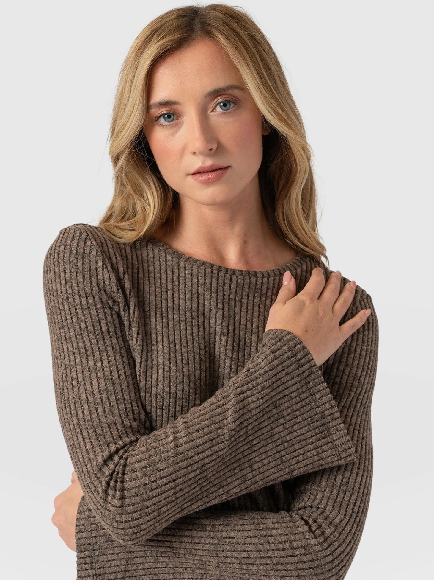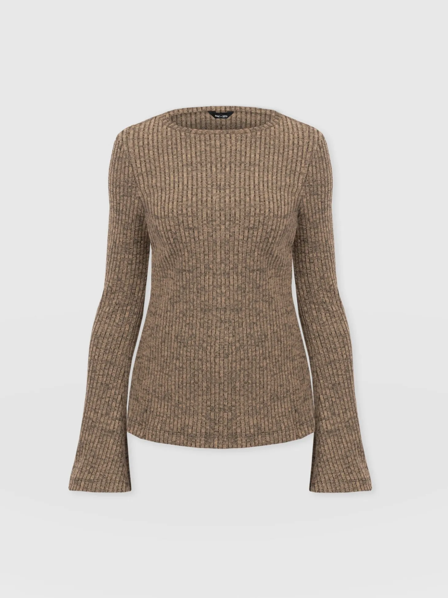 There’s an understated kind of elegance to our Callie Tee. This knitted style in beige features a classic crew neckline with a slim-fitting silhouette that works to define your frame. It’s the sleeves that all eyes are drawn to, though; they’re cut with a fluted cuff for a bohemian touch. And to tie it all together with a touch of sumptuous softness, it’s doused in a lightly textured rib finish. Wear yours with the matching Victory Rib pants to complete the look.