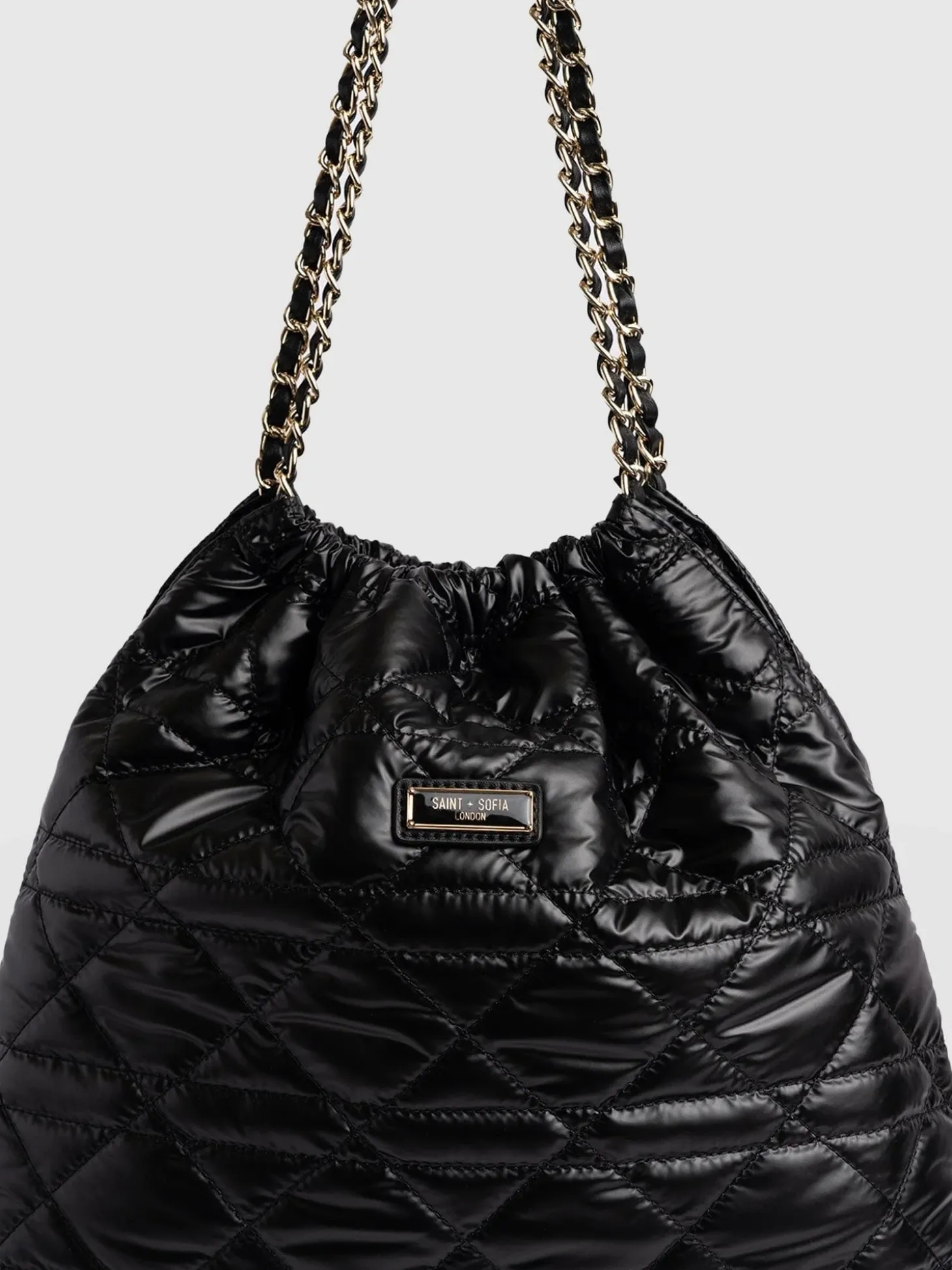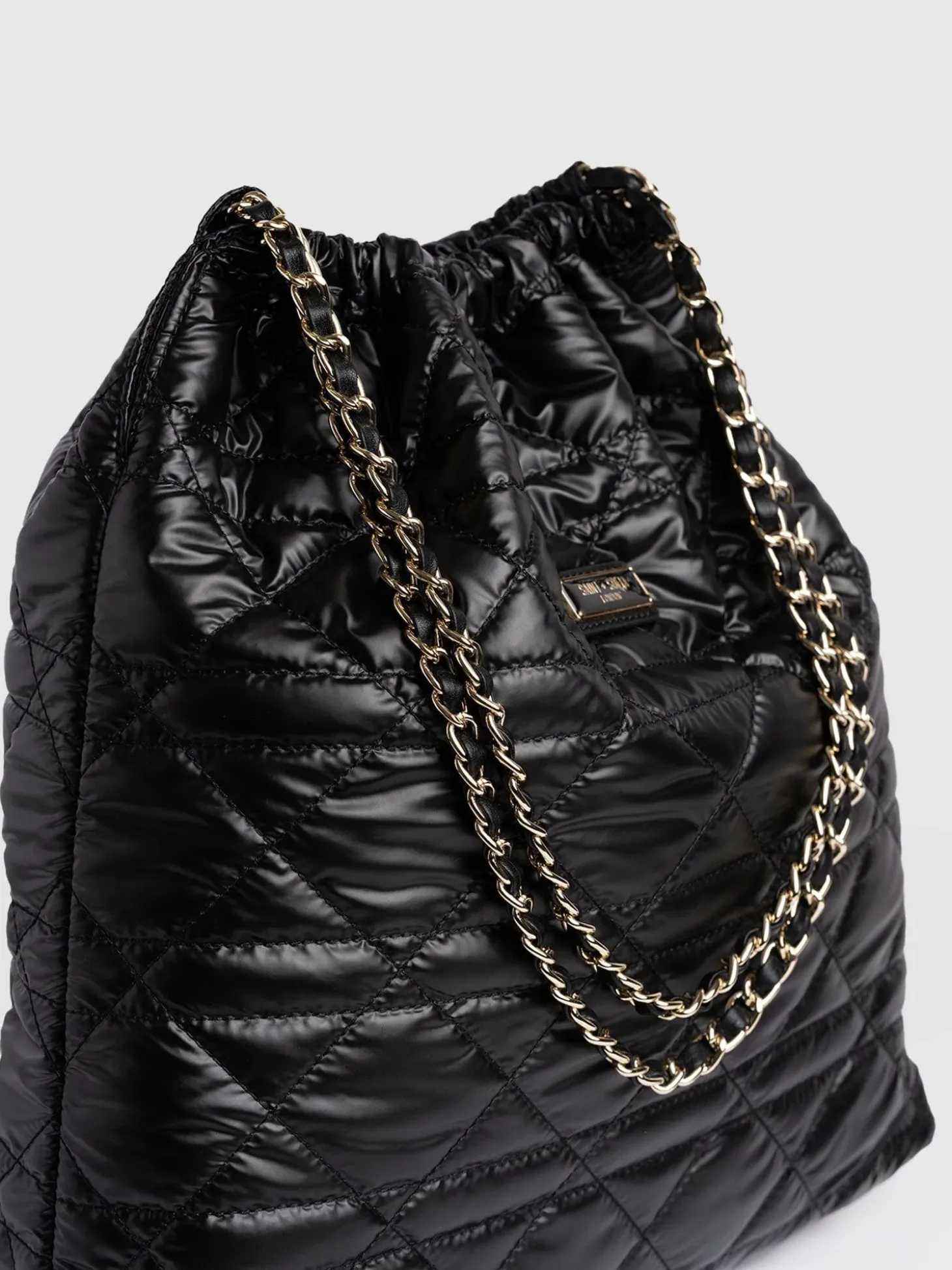 Take a classic tote bag, add a contemporary drawstring closure, and you’ll create the Camilla Bag. This new design is handmade from glossy nylon and textured with a quilted finish. At the top, a gold chainlink strap fastens over your shoulder and adds a glimmering edge to the chic silhouette. Inside, you’ll find plenty of space to store all your essentials and a zipped pocket for your prized possessions.