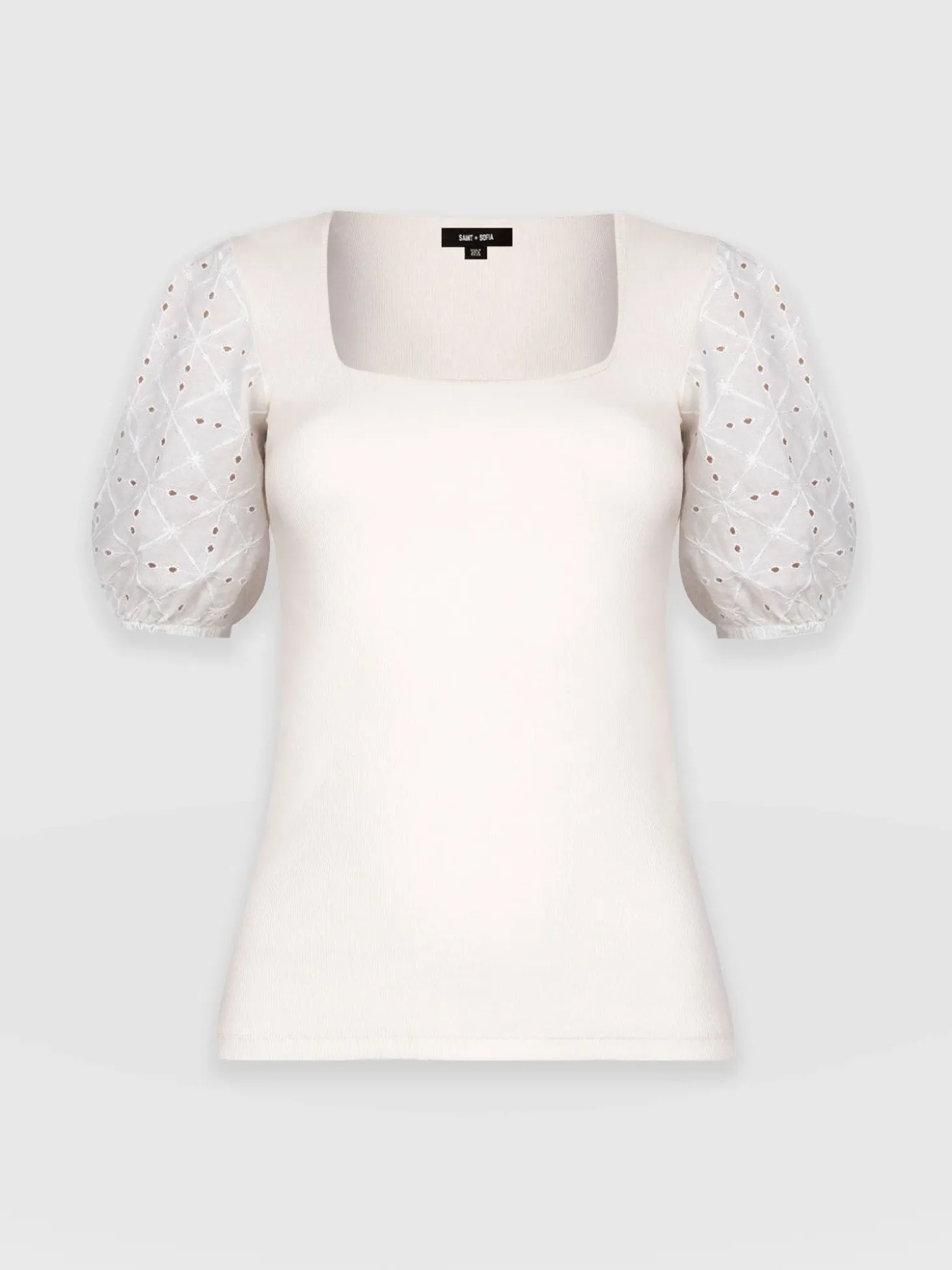A cream top with white broderie anglaise sleeves and a square neck is a stylish and versatile addition. The chic blouse pairs perfectly with the eyelet detail sleeve and the slim fit ensure a flattering silhouette, whether dressed up or down. Made from high-quality materials, it will have you feeling elegant and can be worn for years from now. Complete the look by pairing it with our Keller Wide Leg Pant for a chic and sophisticated look, or your favourite jeans and our Sutton Slides for easy comfort.