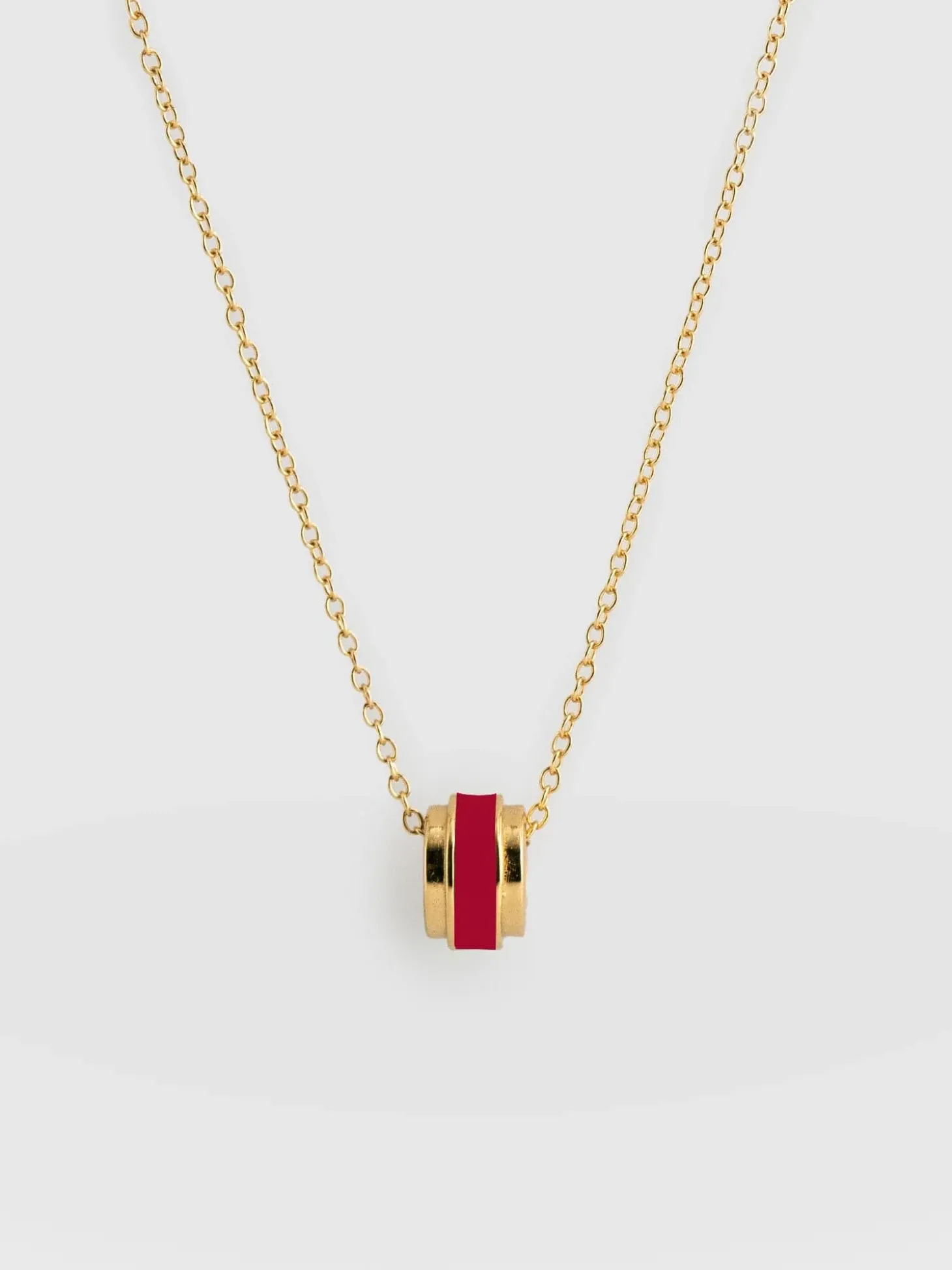 The Enamel Striped Charm Necklace in gold and red is an elegant accessory destined to become your new favourite addition to your jewelry collection. Perfect for styling for work, weekends, or as a gift to loved ones. This trinket features a tasteful bar design with red enamel stripes that fuse with the timeless gold to add a pop of chic colour. Each necklace is handmade by skilled artisans to guarantee precision and a quality that will last for years to come.