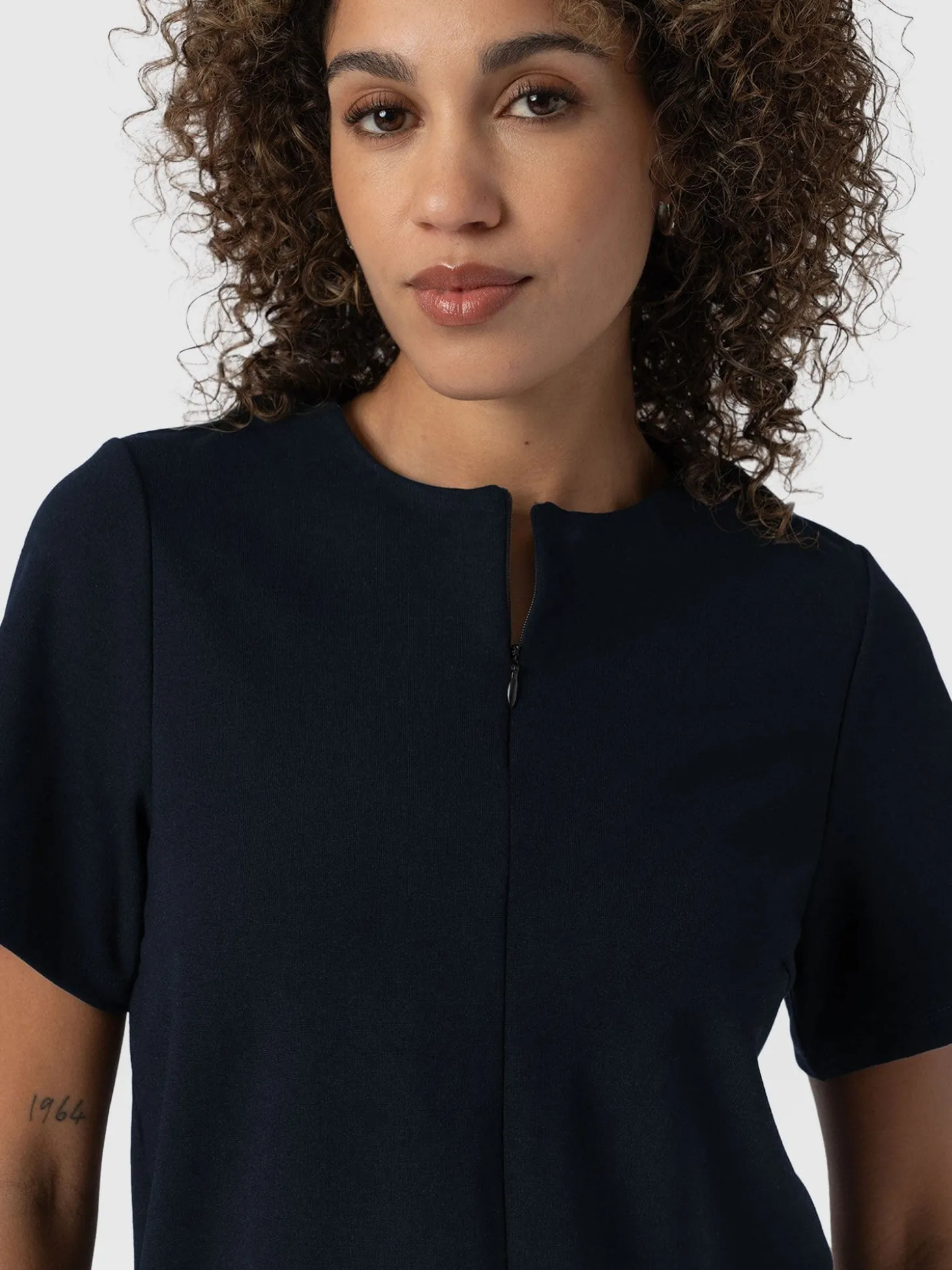 A zip-front tee in navy made from a soft and smooth ponte jersey, that is crease free and easy wear. The Keller top is designed to perfectly match our bestselling Keller Wide Leg Pants for a loungewear co-ord. It features short sleeves and an adjustable neckline that can be worn open or closed to suit your style. Wear yours with the complementing pants and our Spitalfields Trainers for a chic and casual look.
