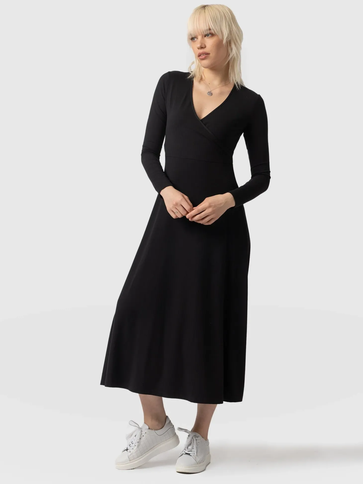 The Maggie Wrap Dress is a beautiful midi and handmade using a soft and sustainable eco-viscose. This chic style features a skin-baring V-neckline mock wrap and a full A-line skirt. Thanks to its long sleeves, it’s perfect for styling all year round; slip yours on in the summer with sneakers and in the winter with a jacket, tights, and boots.