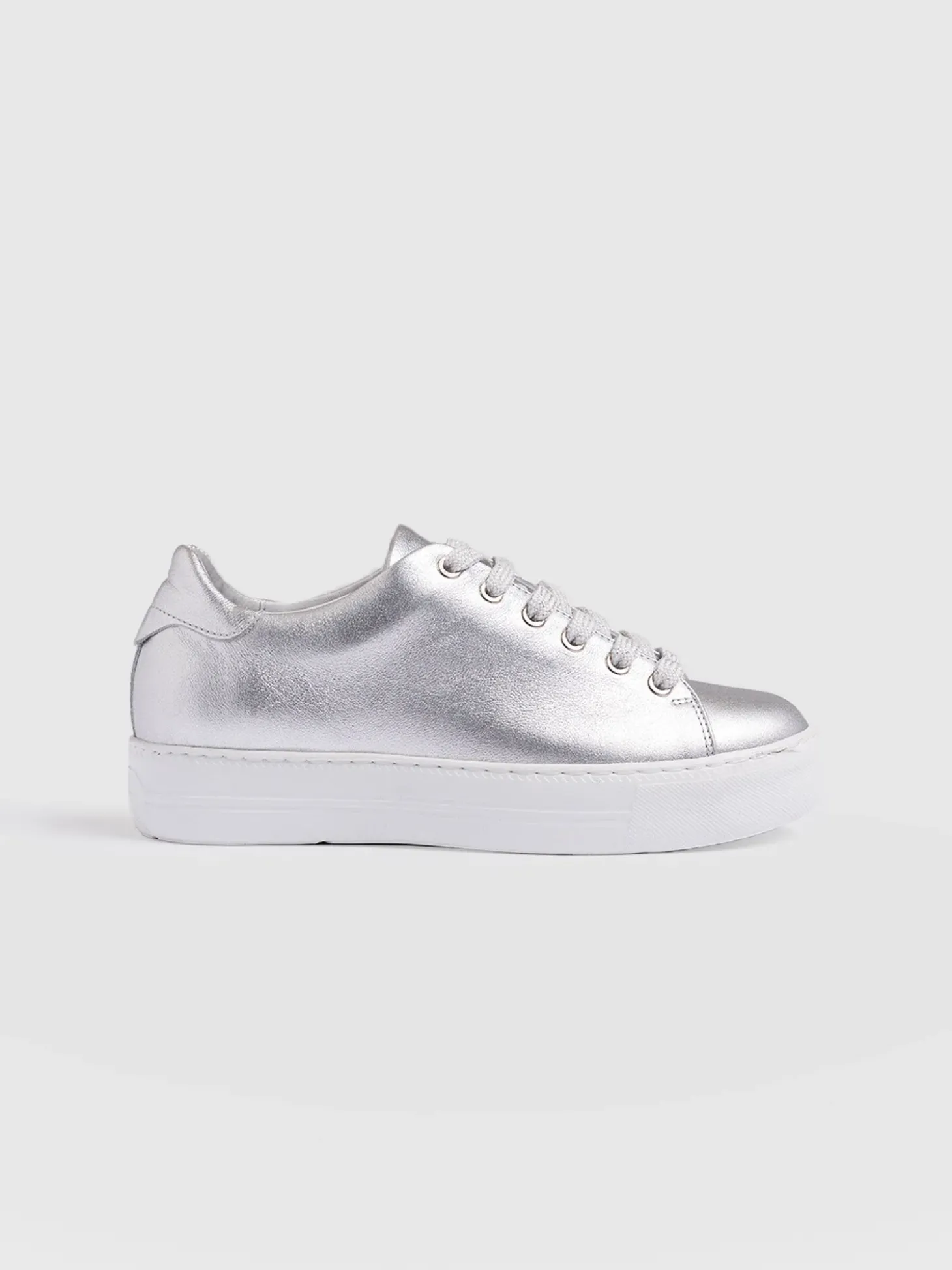 Imagined in metallic silver, the Portland Sneakers are a playful style to add to your collection. They’re designed with all-day comfort in mind and crafted by hand from smooth leather to a low-top silhouette. Finished with contrasting laces and a white platform sole, they create an elevated look when paired with even the most casual outfits. But to make a chic statement on your evenings out, style with the Freya Flared Pants and Astrid Waistcoat.