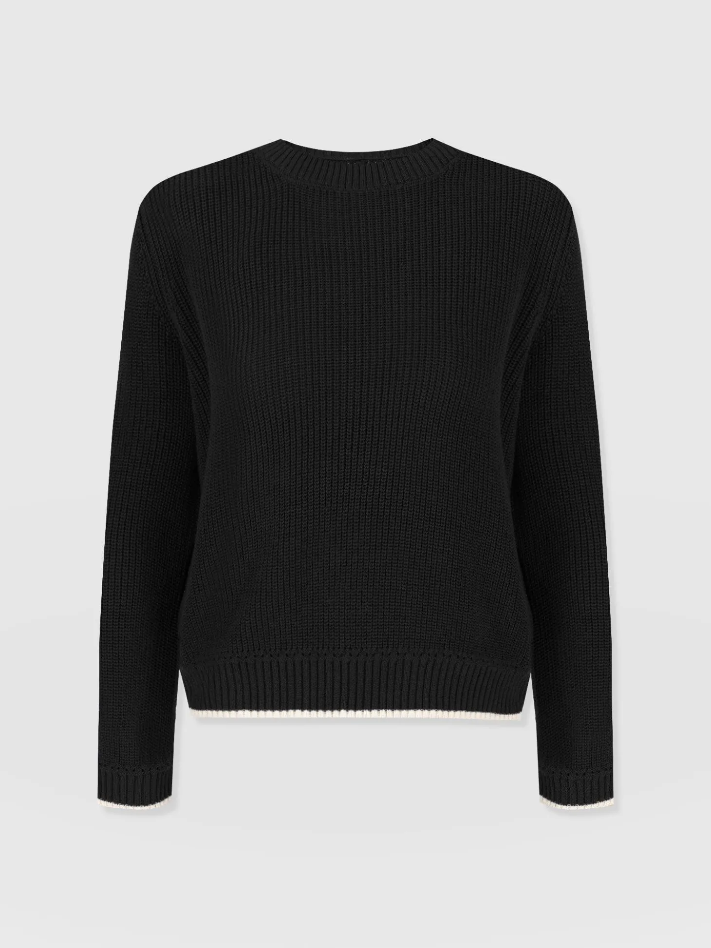 A transitional knit designed for the changing seasons, the Remy Crop Sweater in black boasts a chunky rib stitch to keep you warm when the weather shifts to cooler temperatures. Its regular-fitting silhouette and crew neckline are handmade using soft and smooth organic cotton and trimmed with contrasting tipping along the cuff and hem for an elegant finish. Dress down with high-waisted jeans and trainers, or style up with the Bonham Leather Shorts and boots.