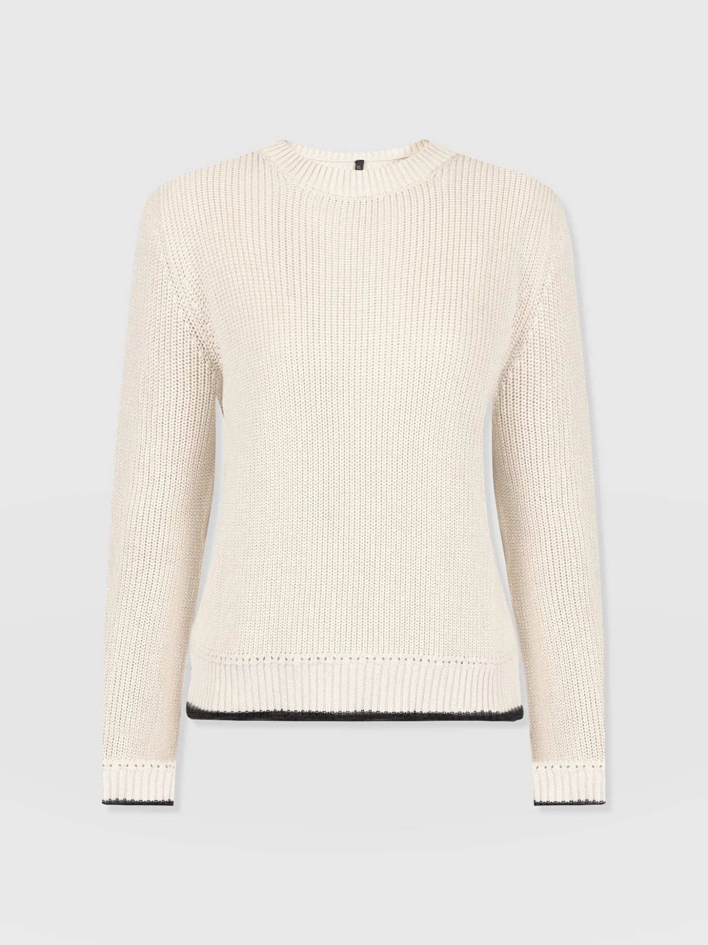 A transitional knit designed for the changing seasons, the Remy Crop Sweater in cream boasts a chunky rib stitch to keep you warm when the weather shifts to cooler temperatures. Its regular-fitting silhouette and crew neckline are handmade using soft and smooth organic cotton and trimmed with contrasting tipping along the cuff and hem for an elegant finish. Dress down with high-waisted jeans and sneakers, or style up with the Bonham Leather Shorts and boots.