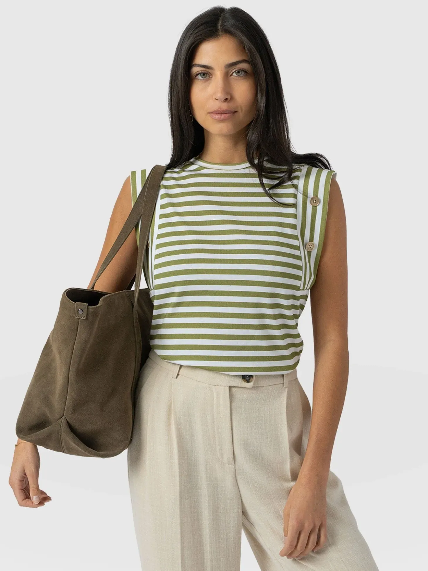 A staple T-shirt to add to your everyday collection, The Rowan Tee is a casual design made from soft and gentle cotton. It’s shaped to a relaxed fit with a sleeveless frame to add some edge to the classic crew-neck silhouette. At the sleeves, gold buttons trace up the sides for a playful touch. Pair yours with the Finsbury Pant or Wide Leg Jeans and your favourite sneakers for a comfortable and always-on-trend look.