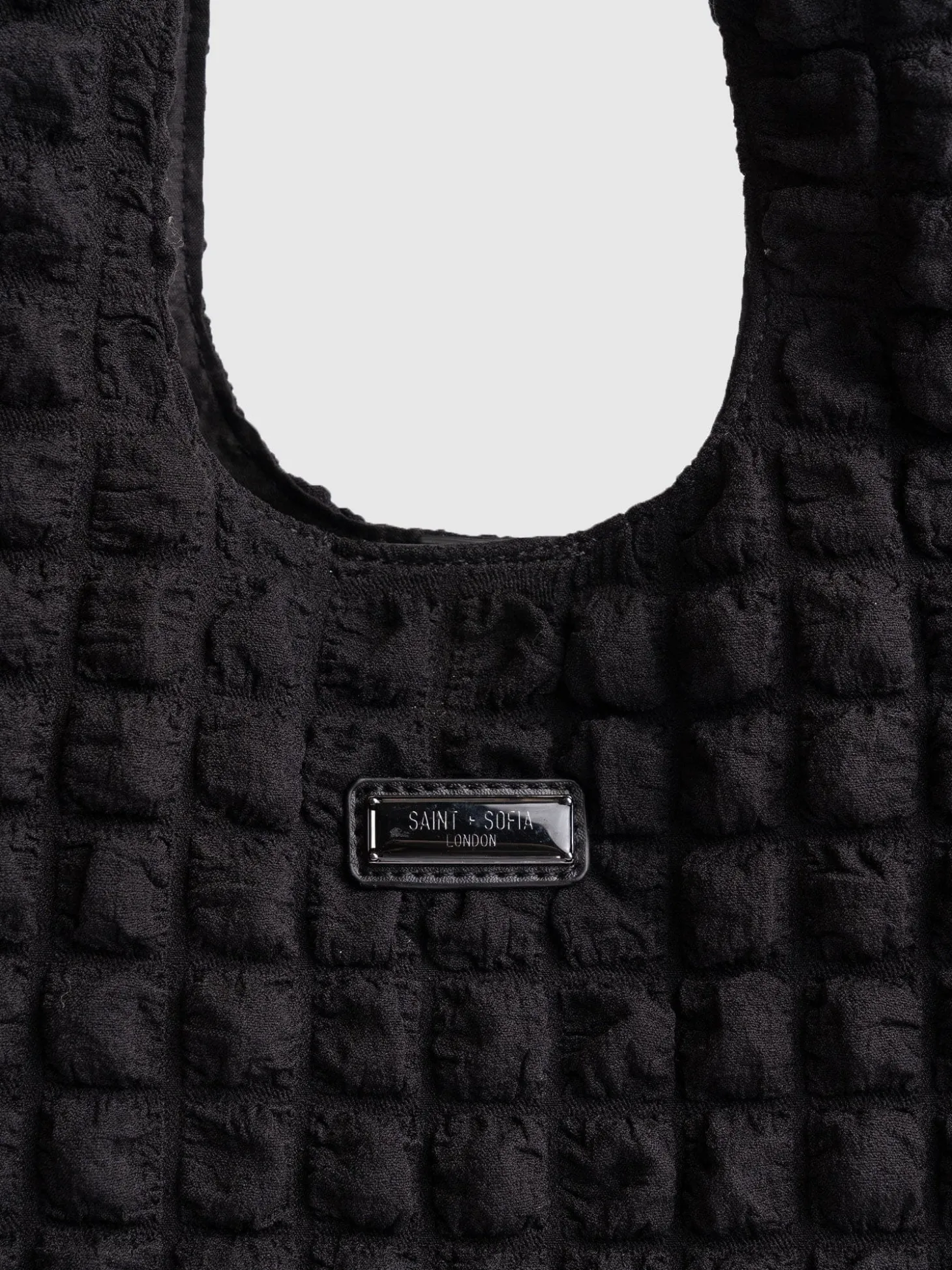 The Soho Shoulder Tote Bag in black is a versatile accessory that effortlessly blends style and practicality. Expertly crafted from premium materials, this fabric tote features an internal pocket that ensures easy organisation and accessibility of your essentials. The bag’s sleek design is elevated with a branded Saint and Sofia plaque that adds a touch of sophistication to the overall look. Whether you’re running errands or heading out for the night, the Soho Shoulder Tote Bag is a perfect choice that offers both style and functionality.