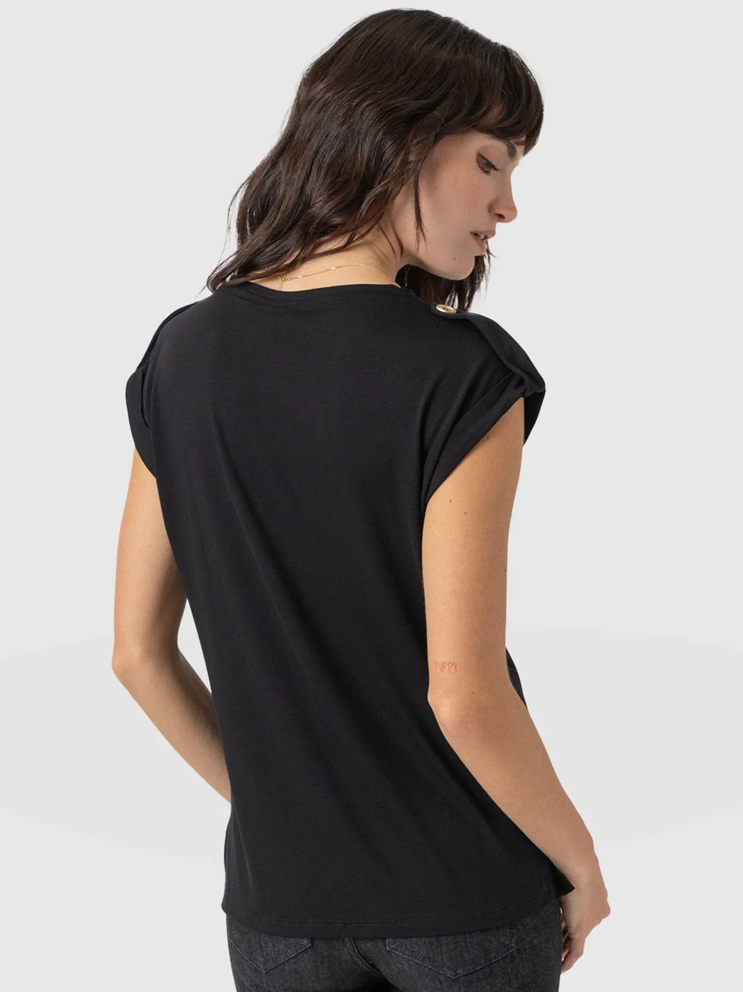 A classic, comfortable crew neck tee in black with rock and roll print detail. Designed for a relaxed, easy fit and with signature button detail on the shoulders. Each one is handmade in Europe using the softest eco viscose fabric for the perfect fit and feel that’s true to size. Pair it with jeans, leggings or skirts on warmer days.