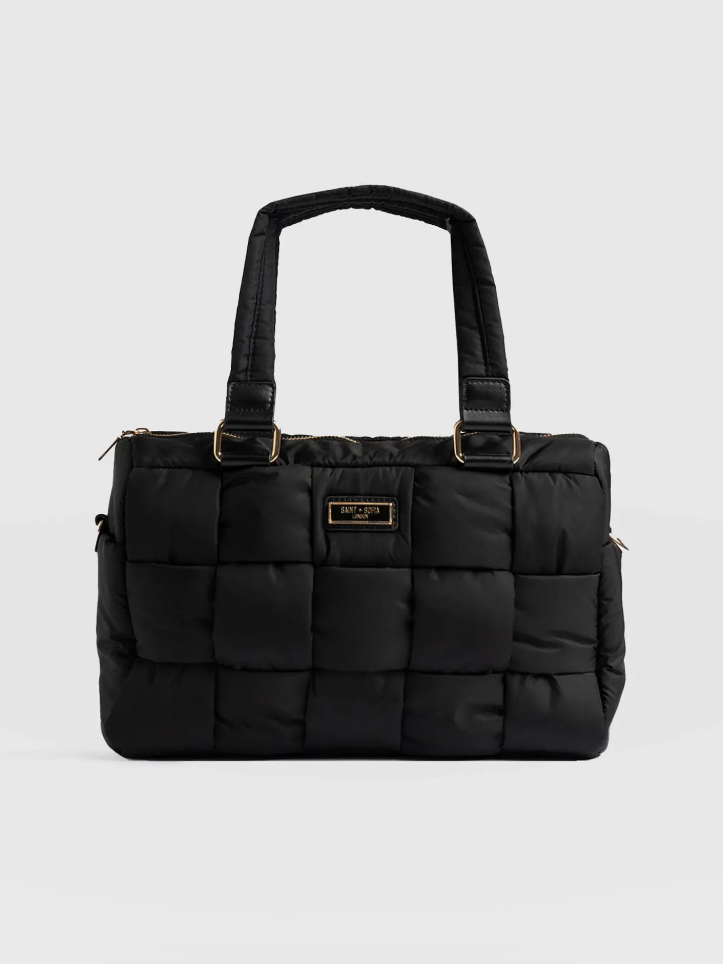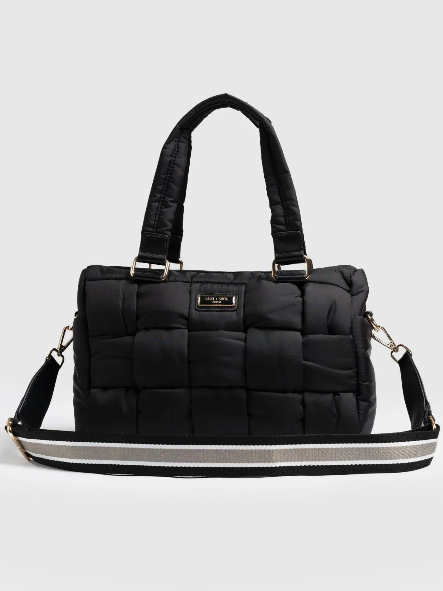The Woven Duffle Bag in black is a chic, classic bag style that is both easy to use and flattering to wear. It’s designed to be multi-purpose for work or weekends. Finished with branded gold trims and a branded plaque on the centre front. It has an easily detachable cross-body strap to wear out or carry with the strap. We’ve also added a striped design on the strap for contrast. This colourway pairs elegantly with a pair of blue denim jeans or a head-to-toe black outfit. Limited number available.