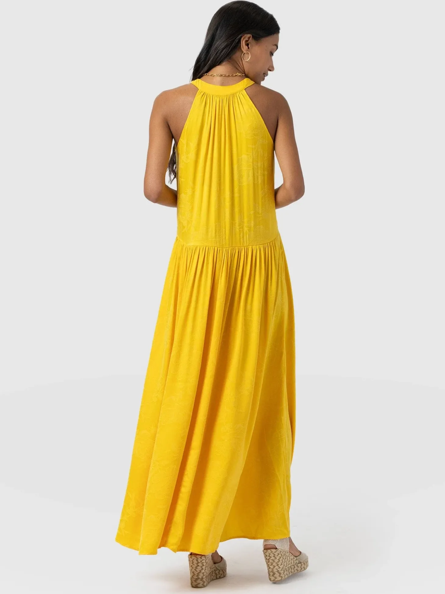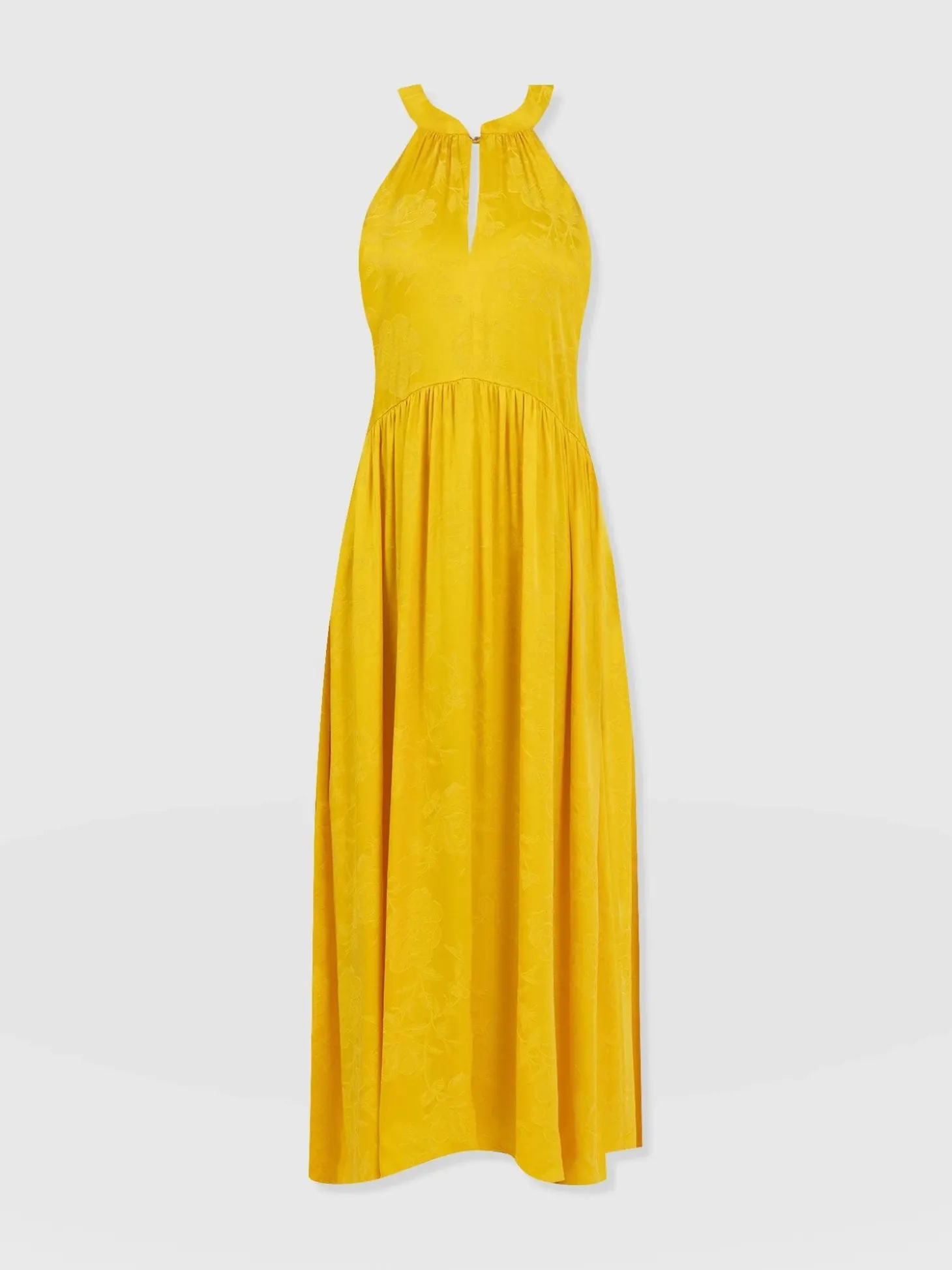 It doesn’t get more elegant than our Zoey Halter Neck Dress in yellow. This beautiful design is handmade by our skilled artisans in Europe using sumptuously soft viscose and is delicately detailed with a floral jacquard. The halterneck bodice features a slim cut-out at the chest before falling into a maxi-length skirt that hangs in gentle pleats. Pair yours with the Bridget Sling Back Heels to complete the look.